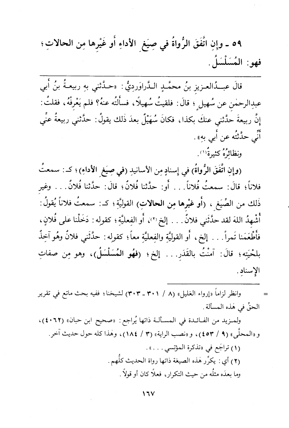 59 - وَإِنِ اتَّفَقَ الرُّوَاةُ فِي صِيَغِ الْأَدَاءِ َوْ غَيْرَهَا مِنَ الْحَالَاتِ؛ فَهُوَ: الْمُسَلْسَلُ.