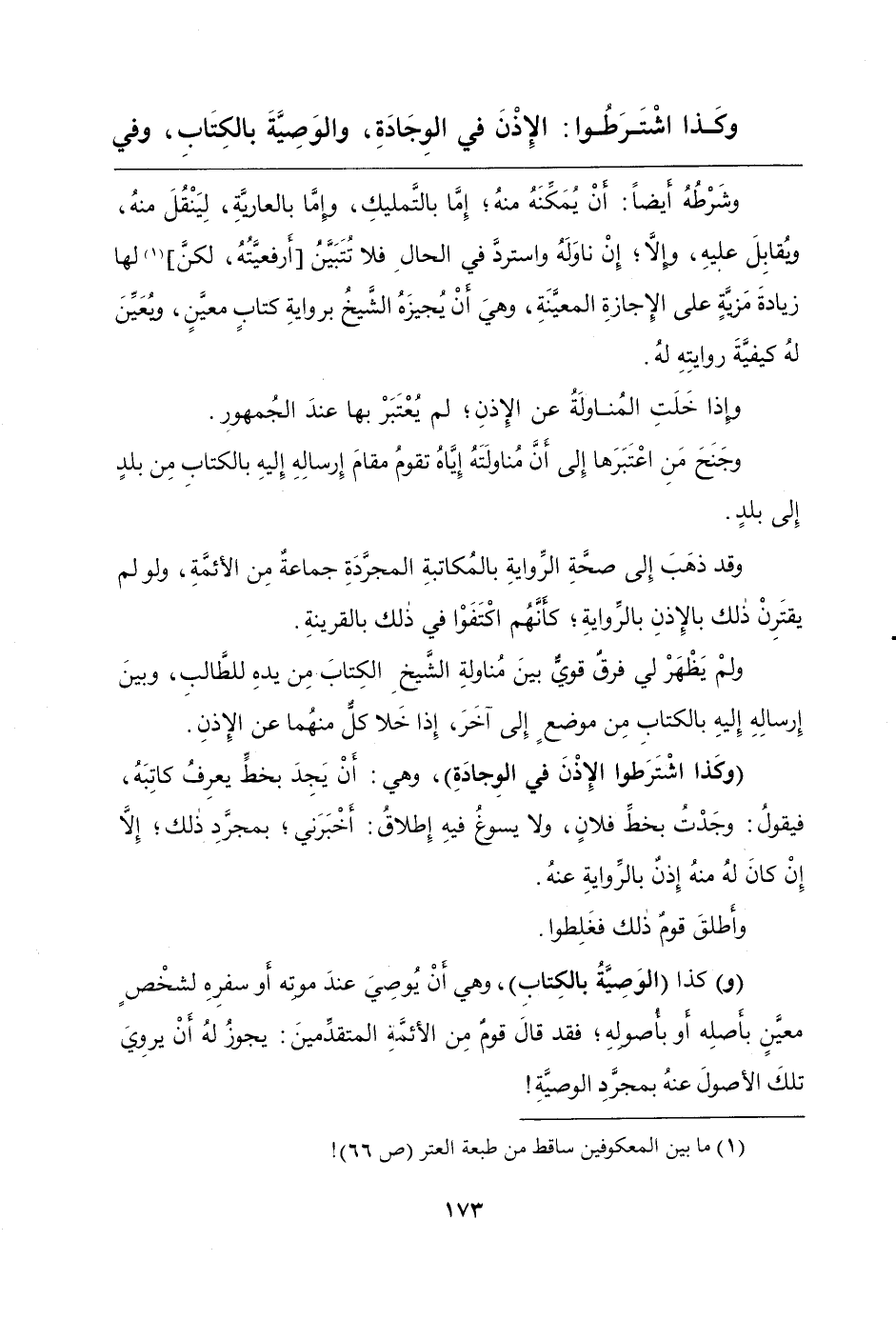 (وكَذا اشْتَرَطُوا الإِذْنَ في الوِجَادَةِ)، وهي: أَنْ يَجِدَ بخطٍّ يعرِفُ كاتِبَهُ، فيقولُ: وجَدْتُ بخطِّ فلانٍ، ولا يسوغُ فيهِ إِطلاقُ: أَخْبَرَني؛ بمجرَّدِ ذلك، إِلاَّ إِنْ كانَ لهُ منهُ إِذنٌ بالرِّوايةِ عنهُ.