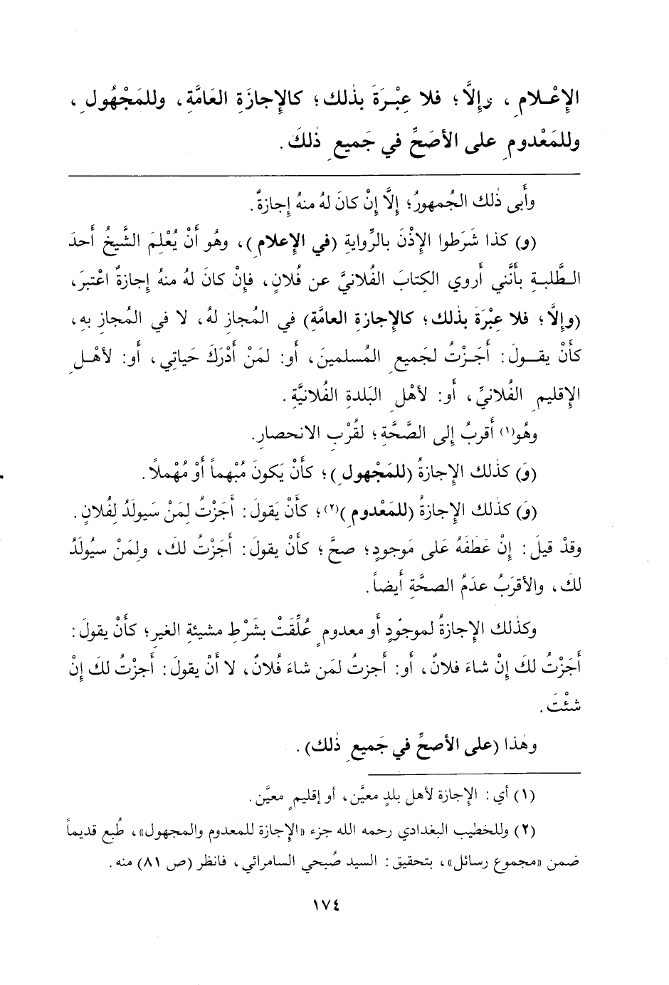 الإِعْلامِ، وإِلاَّ؛ فلا عِبْرَةَ بذلك؛ كالإِجَازَةِ العَامَّةِ، وَللمَجْهُولِ، وَللمَعْدومِ على الأصَحِّ في جَميعِ ذلكَ.