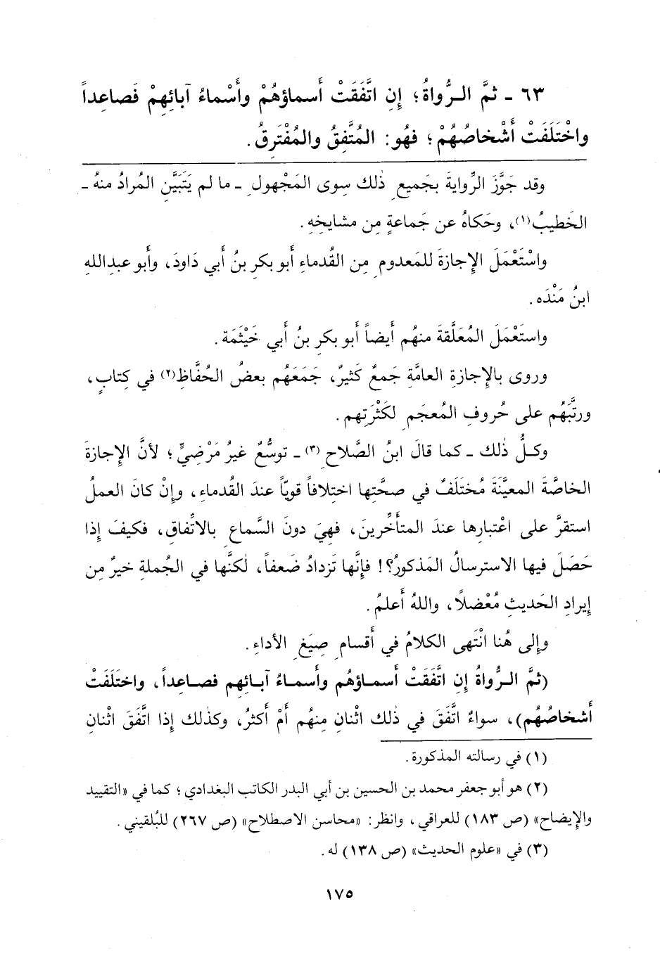 63 - ثُمَّ الرُّوَاةُ؛ إَنِ اتَّفَقَتْ أَسْمَاؤُهُمْ وَأَسْمَاءُ آَبَائِهِمْ فَصَاعِدًا وَاخْتُلِفَتْ أَشْخَاصُهُمْ؛ فَهُوَ: الْمُتَّفِقُ وَالْمُفْتَرِقُ.