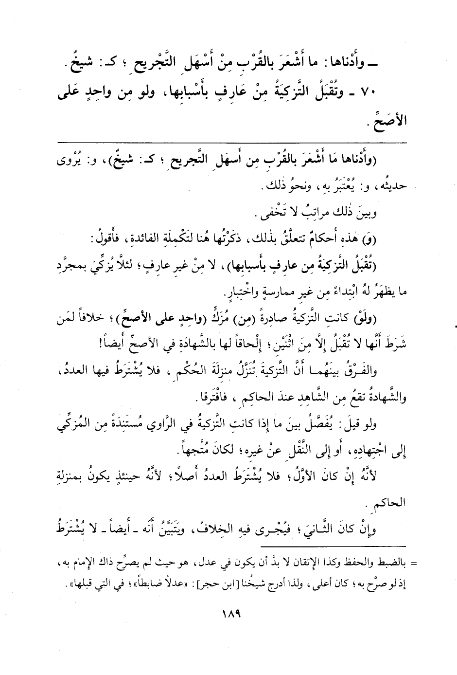 70 - وَتُقْبَلُ التَّزْكِيَةُ مِنْ عَارِفٍ بَأَسْبَابِهَا، وَلَوْ مِنْ وَاحِدٍ عَلَى الْأَصَحِّ.
