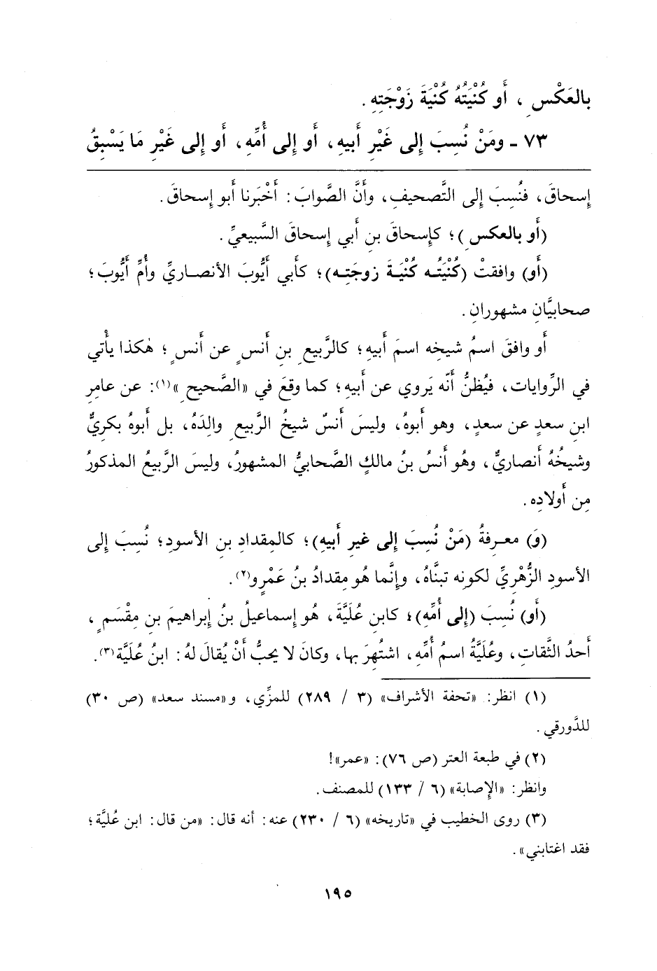 73 - وَمَنْ نُسِبَ إِلَى غَيْرِ أَبِيهِ، أَوْ إِلَى أُمِّهِ، أَوْ إِلَى غَيْرِ مَا يَسْبِقُ