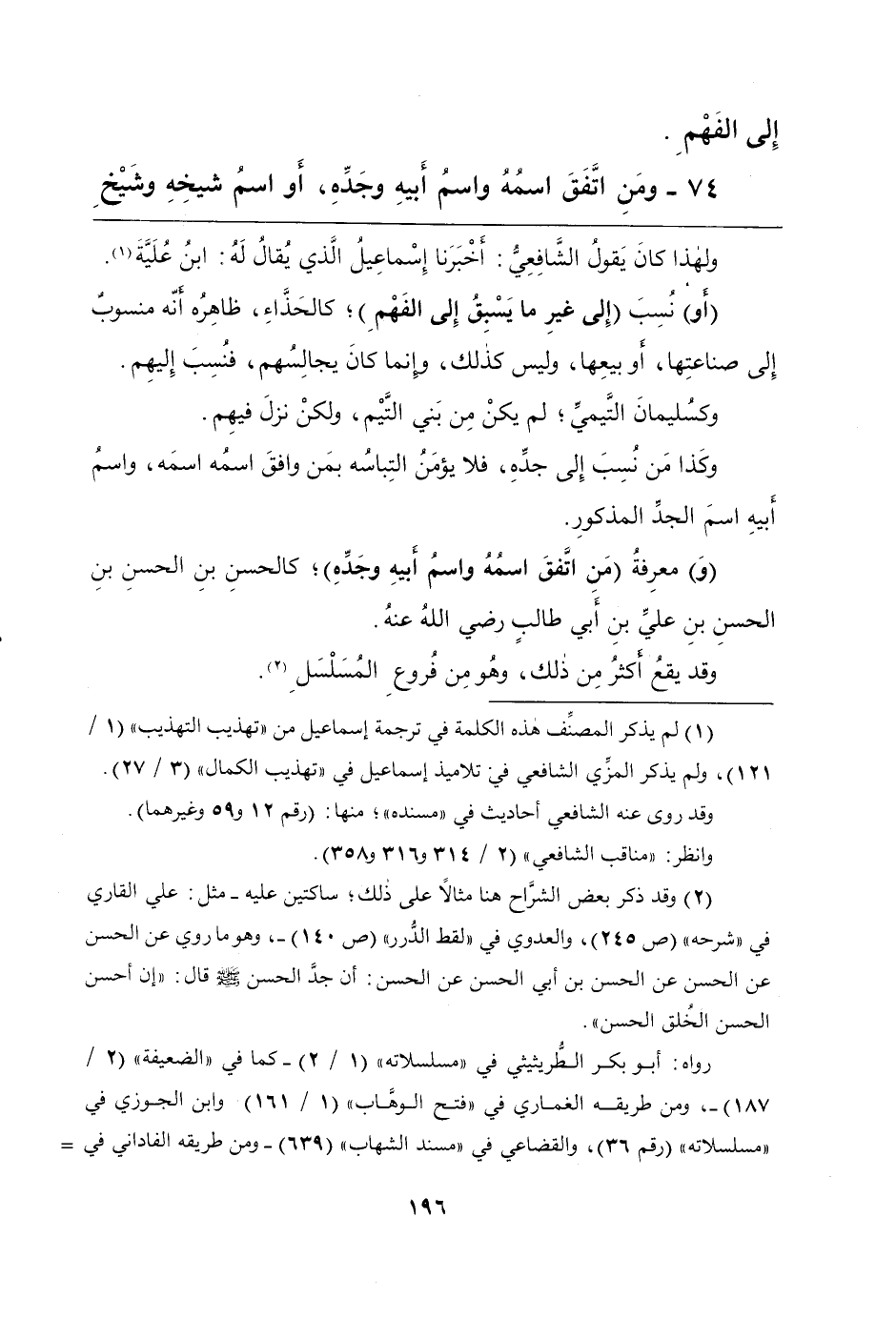 74 - وَمَنِ اتَّفَقَ اسْمُهُ وَاسْمُ أَبِيهِ وَجَدِّهِ، أَوْ اسْمُ شَيْخِهِ وَشَيْخِ