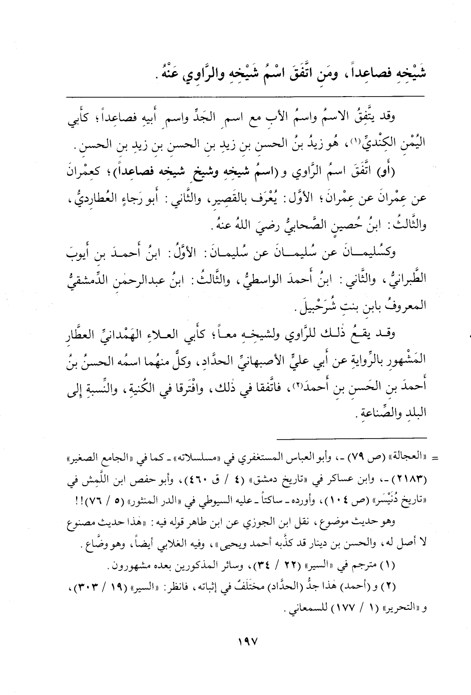 وقد يقعُ ذلك للرَّاوي ولشيخِهِ معاً؛ كأَبي العلاءِ الهَمْدانيَّ العطَّارِ المَشْهورِ بالرِّوايةِ عن أَبي عليٍّ الأصبهانيِّ الحدَّادِ، وكلٌّ منهُما اسمُه الحسنُ بنُ أَحمدَ بنِ الحَسنِ بنِ أَحمدَ، فاتَّفقا في ذلك، وافْتَرقا في الكُنيةِ، والنِّسبةِ إِلى البلدِ والصِّناعةِ.