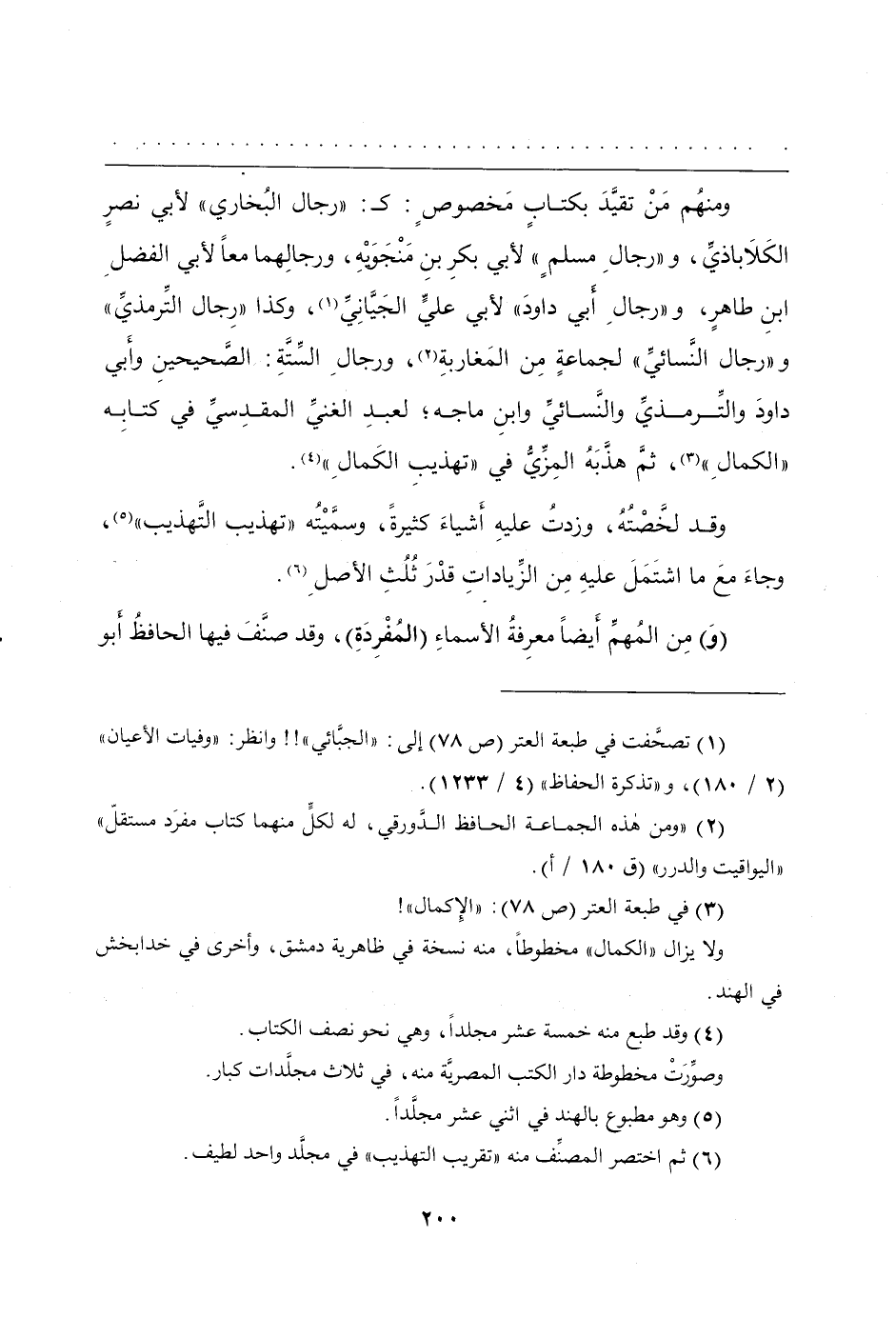 ومنهُم مَنْ تَقيَّدَ بكتابٍٍ مَخصوصٍ: كـ "رجال البُخاري" لأبي نصرٍ الكَلاَباذيِّ، و"رجالِ مسلمٍ" لأبي بكرِ بنِ مَنْجَوَيْهِ، ورجالِهما معاً لأَبي الفضلِ بنِ طاهرٍ، و"رجالِ أبي داودَ" لأبي عليٍّ الجيَّانِي، وكذا "رِجال التِّرمذيِّ" و"رجال النَّسائيِّ" لجماعةٍ مِن المَغاربةِ، ورجالِ السِّتَّةِ: الصَّحيحينِ وأَبي داودَ والتِّرمذيِّ والنَّسائيِّ وابنِ ماجة؛ لعبدِ الغنيِّ المقدِسيِّ في كتابِه "الكمالِ"، ثمَّ هذَّبَهُ المِزِّيُّ في "تهذيبِ الكَمالِ".