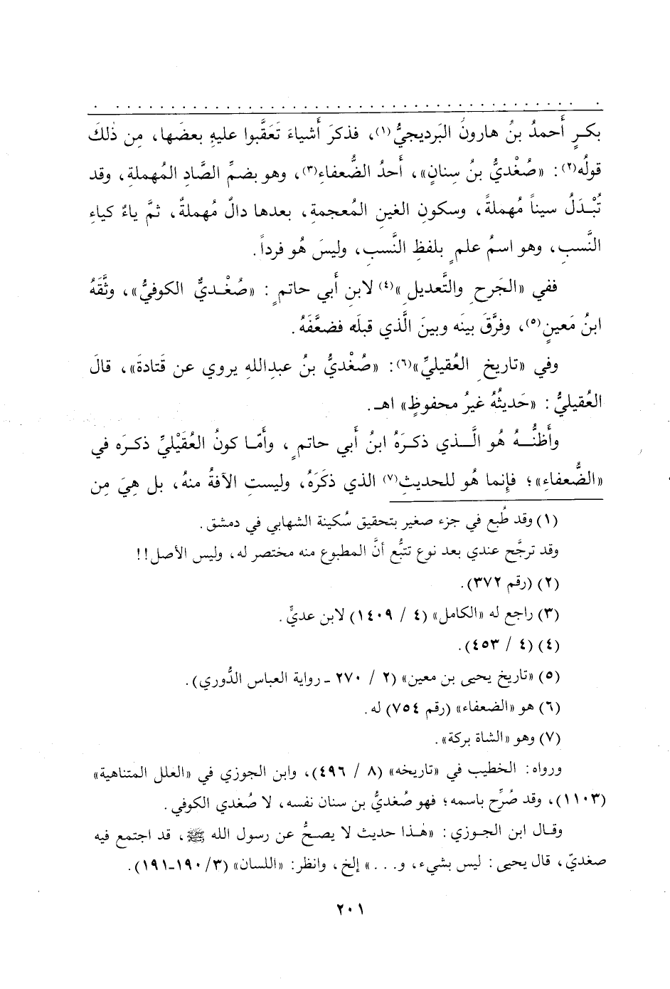 بكرٍ أَحمدُ بنُ هارونَ البَرديجيُّ، فذكرَ أَشياءَ تَعَقَّبوا عليهِ بعضَها، مِن ذلك قولُه: "صُغْديُّ بنُ سِنانٍ"، أَحدُ الضُّعفاءِ، وهو بضمِّ الصَّادِ المُهملةِ، وقد تُبْدلُ سيناً مُهملة، وسكونِ الغينِ المُعجمةِ، بعدها دالٌ مُهملةٌ، ثمَّ ياءٌ كياءِ النَّسبِ، وهو اسمُ علمٍ بلفظِ النَّسبِ، وليسَ هُو فرداً.