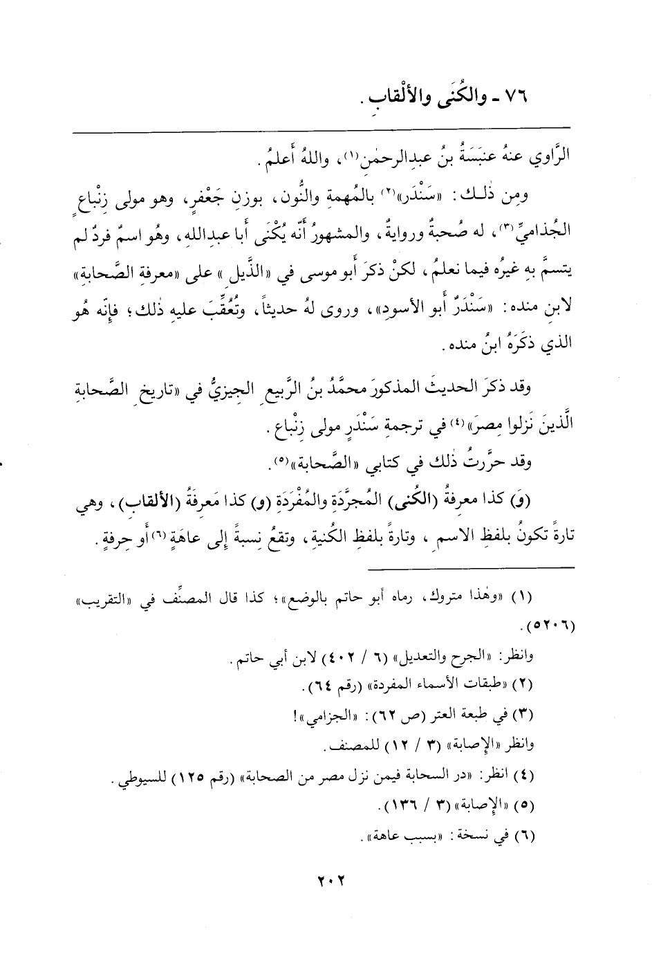 ومِن ذلك: "سَنْدَر" بالمُهْمَلةِ والنُّون، بوزنِ جَعْفرٍ، وهو مولى زِنْبَاعٍ الجُذاميِّ، له صُحبةٌ وروايةٌ، والمشهورُ أَنَّه يُكْنَى أَبا عبدِ اللهِ، وهُو اسمٌ فردٌ لم يتسمَّ بهِ غيرُه فيما نعلمُ، لكنْ ذكرَ أَبو موسى في "الذَّيلِ على معرفةِ الصَّحابةِ" لابنِ منده: سَنْدَرٌ أَبو الأسودِ، وروى لهُ حديثاً، وتُعُقِّبَ عليهِ ذلك؛ فإِنَّه هُو الذي ذكَرَهُ ابنُ منده.
