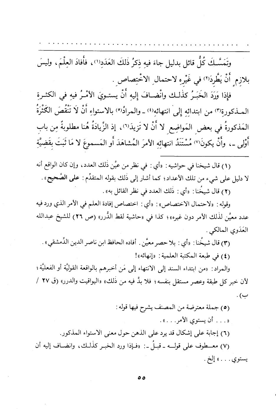 وتَمَسَّكَ كُلُّ قائل بدليل جاءَ فيه ذِكرُ ذلكَ العَدَدِ، فأفادَ العِلْمَ، وليسَ بلازِمٍ أَنْ يَطَّرِدَ في غَيْرِهِ لاحتمالِ الاخْتِصاصِ.