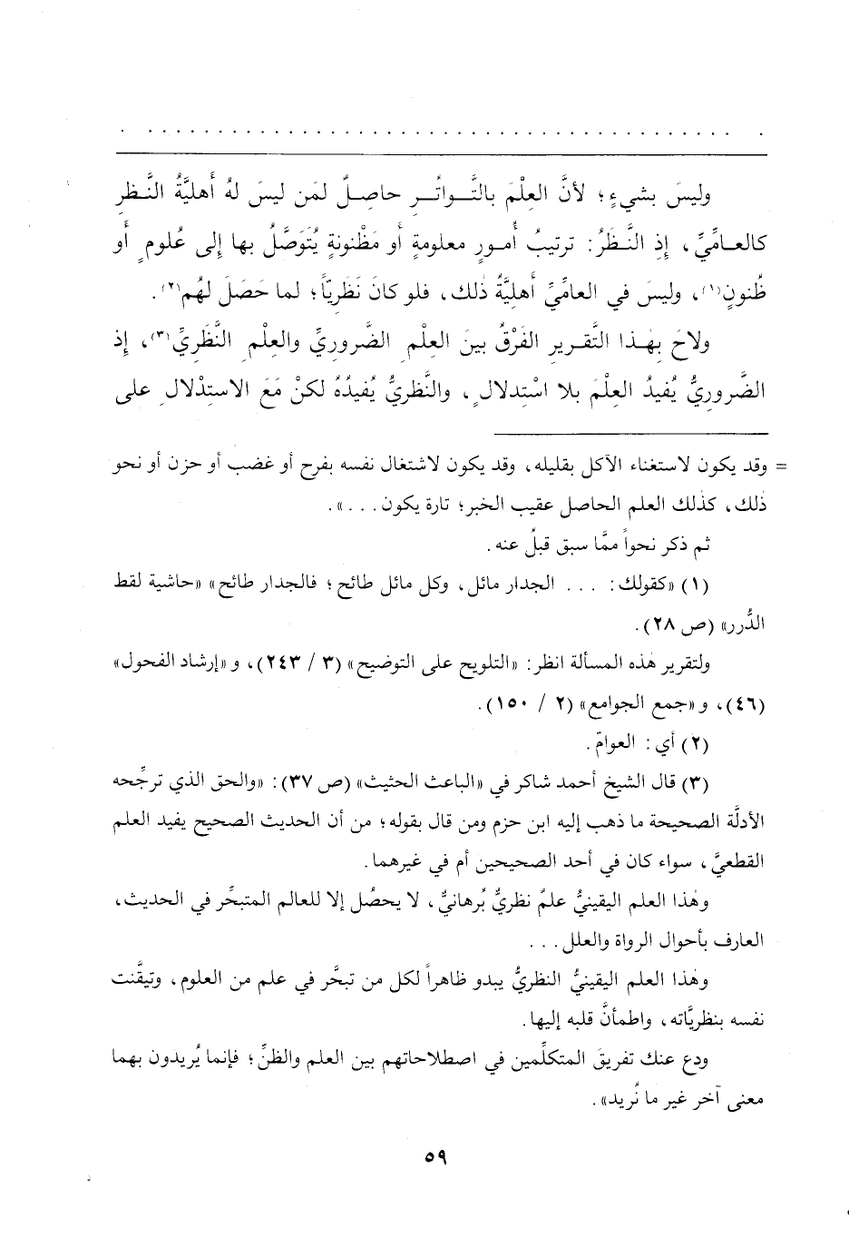 ولاحَ بهذا التَّقريرِ الفرْقُ بين العِلْمِ الضَّرورِيِّ والعِلْمِ النَّظَرِيِّ، إِذ الضَّرورِيُّ يُفيدُ العِلْمَ بلا اسْتِدلالٍ، والنَّظريُّ يُفيدُهُ لكنْ مع الاستِدْلالِ على