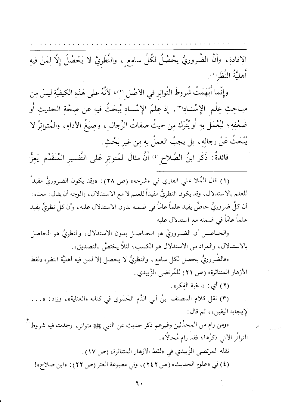 الإِفادةِ، وأنَّ الضَّروريَّ يحْصُلُ لكُلِّ سامعٍ، والنَّظَرِيَّ لا يَحْصُلُ إِلاَّ لِمَنْ فيهِ أهليَّةُ النَّظَرِ.