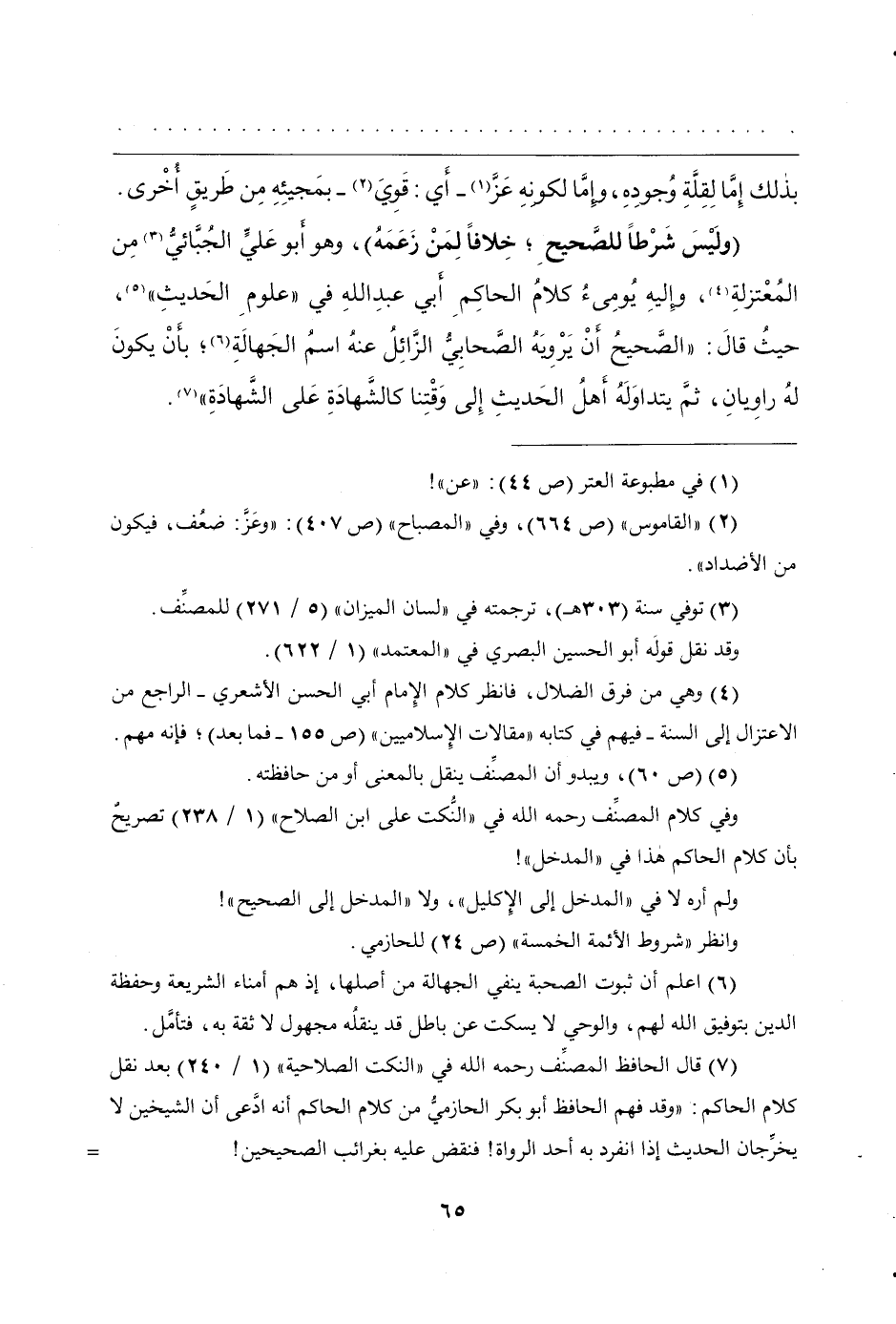 (ولَيْسَ شَرْطاً للصَّحيحِ؛ خِلافاً لمَنْ زعَمَهُ )، وهو أَبو عَليٍّ الجُبَّائيُّ مِن المُعْتزلةِ، وإِليهِ يُومِئُ كلامُ الحاكِمِ أَبي عبد اللهِ في "علومِ الحديثِ" حيثُ قال: الصَّحيحُ أَنْ يَرْوِيَهُ الصَّحابِيُّ الزَّائِلُ عنهُ اسمُ الجَهالةِ؛ بأَنْ يكونَ لهُ راوِيانِ، ثمَّ يتداوَلَهُ أَهلُ الحَديثِ إِلى وَقْتِنِا كالشَّهادَةِ عَلى الشَّهادَةِ.