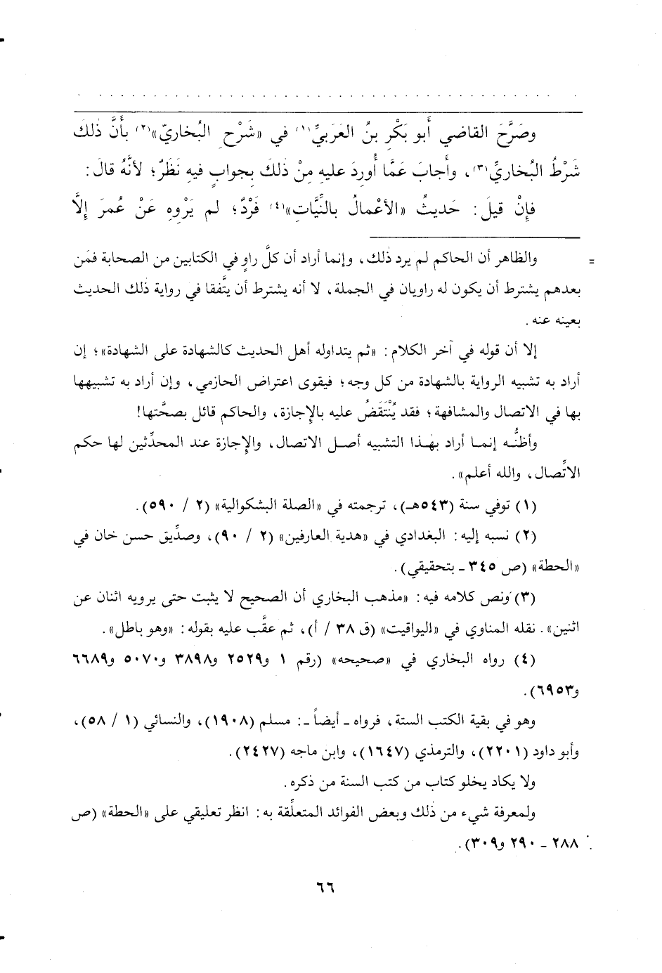 وصَرَّحَ القاضي أَبو بَكْرٍ بنُ العربيِّ في "شَرْحِ البُخاريّ" بأَنَّ ذلك شَرْطُ البُخاريِّ، وأَجاب عمَّا أُورِدَ عليهِ مِنْ ذلك بِجوابٍ فيهِ نَظرٌ؛ لأَنَّهُ قال: فإِنْ قيلَ: حديثُ "إنما الأعْمَالُ بالنِّيَّاتِ" فَرْدٌ؛لم يَرْوِهِ عَنْ عُمرَ إِلاَّ
