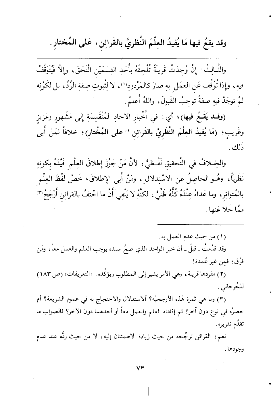 وَقَدْ يَقعُ فِيْهَا مَا يُفيدُ العِلْمَ النَّظريَّ بالقَرائِنِ؛ عَلى المُختارِ