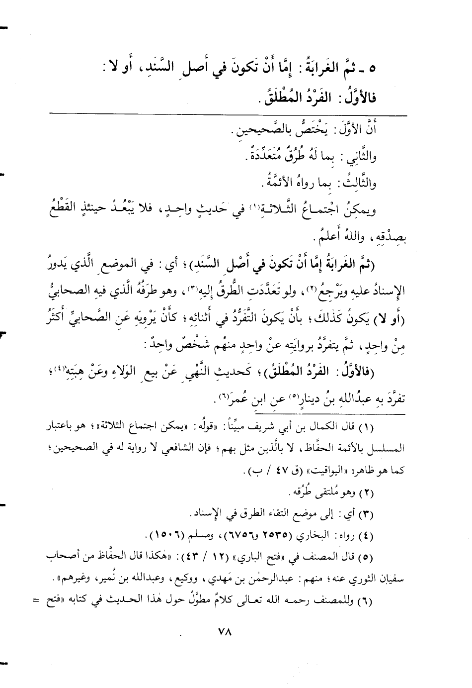 (فالأوَّلُ: الفَرْدُ المُطْلَقُ)؛ كَحديثِ النَّهْيِ عَنْ بيعِ الوَلاءِ وعَنْ هِبَتِهِ؛ تفرَّدَ بهِ عبدُ اللهِ بنُ دينارٍ عنِ ابنِ عُمرَ.