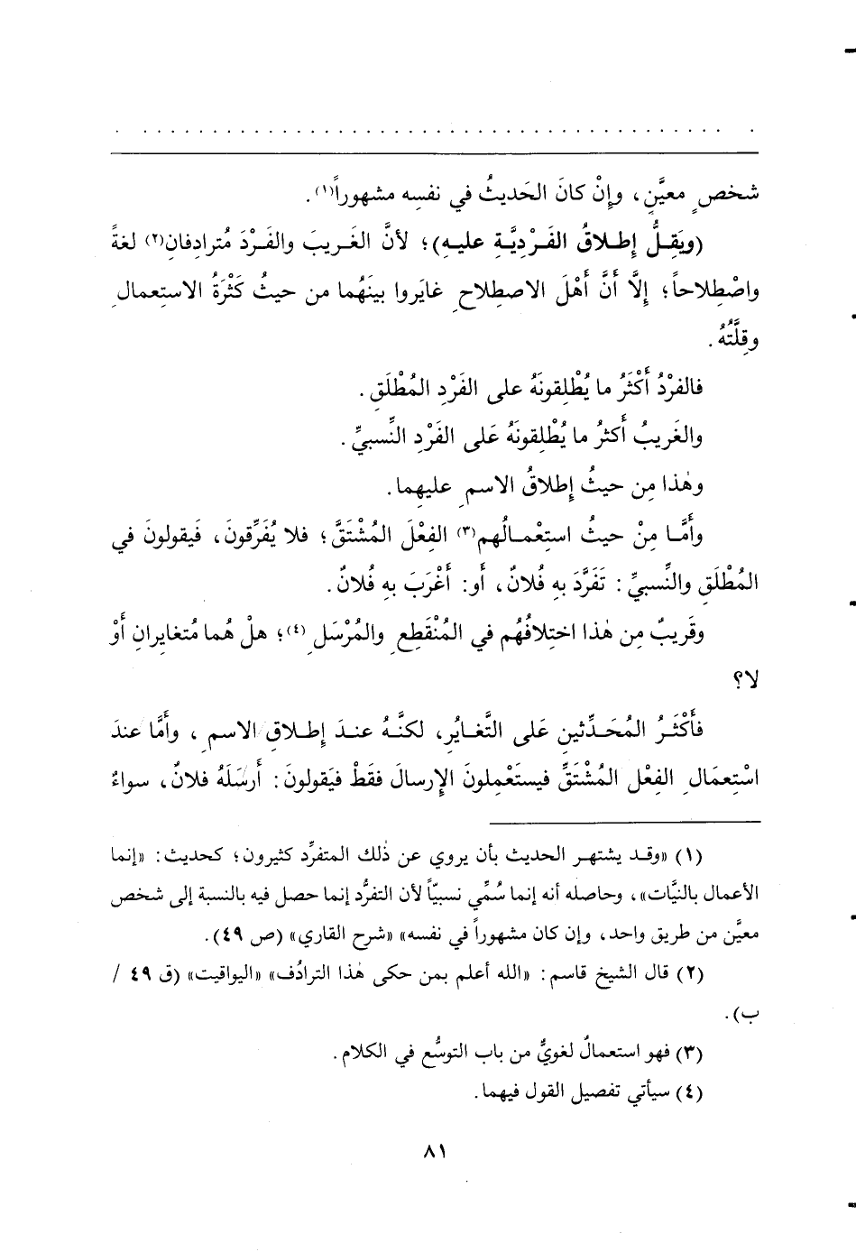 وأَمَّا مِنْ حيثُ استِعْمالُهم الفِعْلَ المُشْتَقَّ؛ فلا يُفَرِّقونَ، فَيقولونَ في المُطْلَقِ والنِّسْبيِّ: تَفَرَّدَ بِهِ فُلانٌ، أَوْ: أَغْرَبَ بِهِ فُلانٌ.