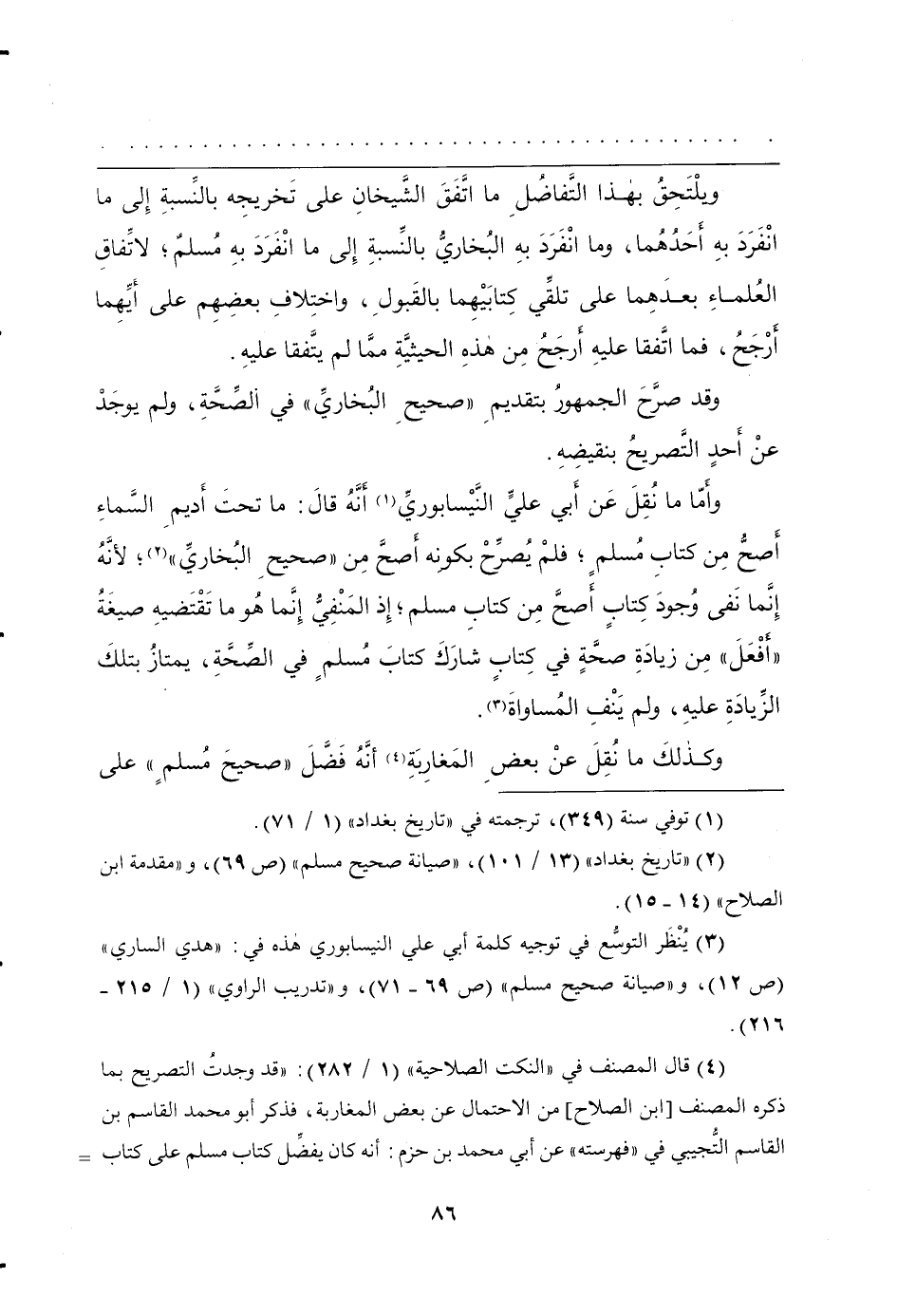 وأَمّا ما نُقِلَ عَن أبي عليٍّ النَّيْسابوريِّ أَنَّهُ قالَ: ما تحتَ أَديمِ السَّماءِ أَصحُّ مِن "كتابِ مُسلمٍ"؛ فلمْ يُصرِّحْ بكونِه أَصحَّ مِن "صحيحِ البُخاريِّ"؛ لأَنَّهُ إِنَّما نَفَى وُجودَ كتابٍ أَصحَّ مِن "كتابِ مسلم"؛ إِذ المَنْفِيُّ إِنَّما هُو ما تَقْتَضيهِ صيغَةُ أَفْعَلَ من زيادَةِ صحَّةٍ في كتابٍ شارَكَ "كتابَ مُسلمٍ" في الصِّحَّةِ، يمتازُ بتلكَ الزِّيادَةِ عليه، ولم يَنْفِ المُساواةَ.