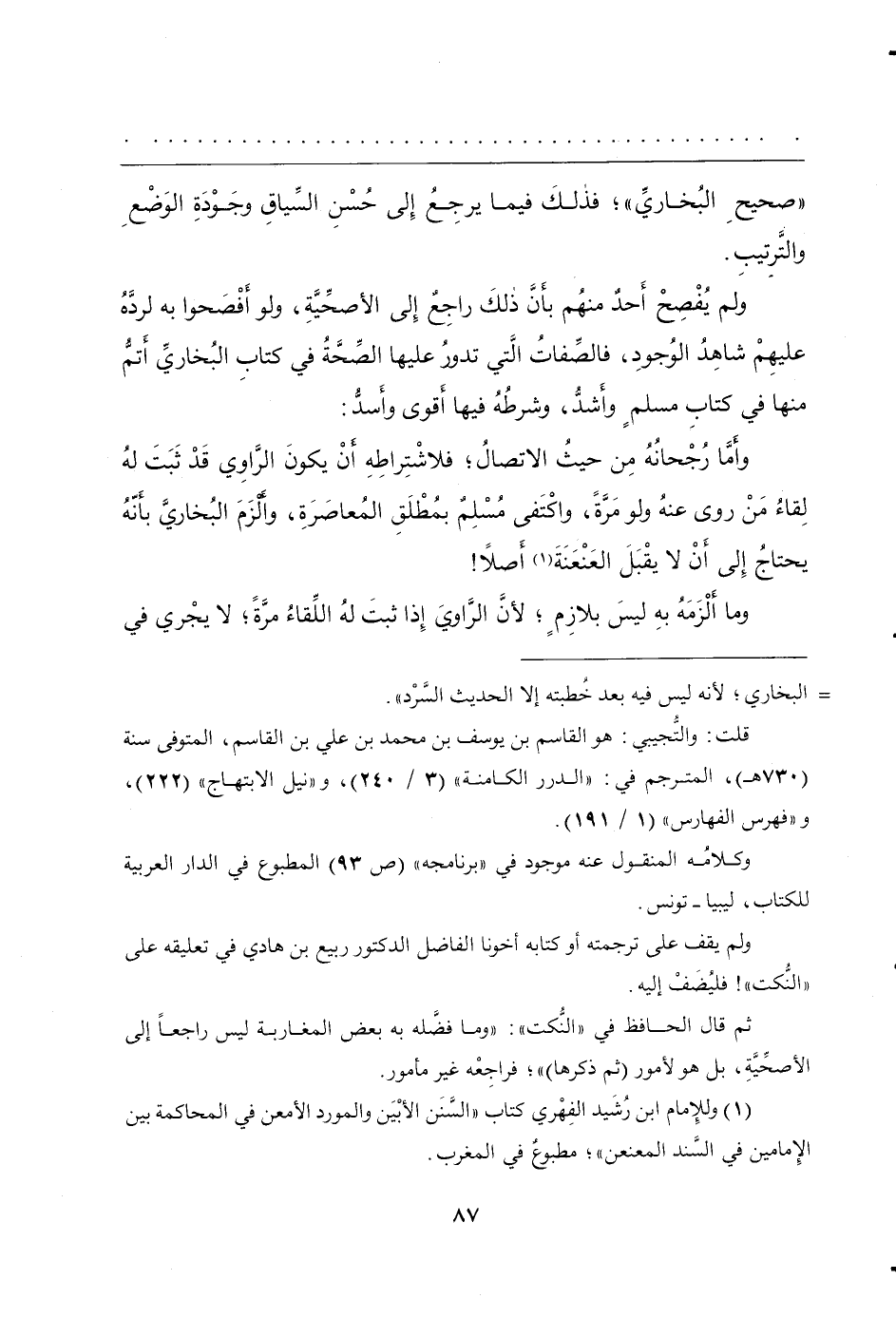 ولم يُفْصِحْ أَحدٌ منهُم بأَنَّ ذلكَ راجِعٌ إِلى الأصحِّيَّةِ، ولو أَفْصَحوا به لردَّهُ عليهِمْ شاهِدُ الوُجودِ، فالصِّفاتُ الَّتي تدورُ عليها الصِّحَّةُ في "كتابِ البُخاريِّ" أَتمُّ منها في "كتابِ مسلمٍ" وأَشَدُّ، وشرطُهُ فيها أَقوى وأَسَدُّ.