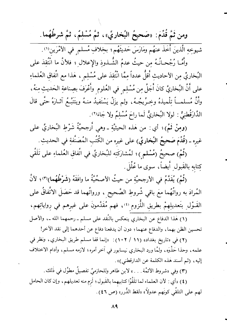 وأَمَّا رُجْحانُهُ مِن حيثُ عدمُ الشُّذوذِ والإِعلالِ؛ فلأنَّ ما انْتُقِدَ على البُخاريِّ مِن الأحاديثِ أَقلُّ عدداً مِمَّا انْتُقِدَ على مُسْلِمٍ، هذا مع اتِّفاقِ العُلماءِ على أنَّ البُخاريَّ كانَ أَجلَّ مِن مُسْلِمٍ في العُلومِ وأَعْرَفَ بصِناعةِ الحَديثِ مِنهُ، وأَنَّ مُسلماً تِلْميذهُ وخِرِّيجُهُ، ولم يزَلْ يَسْتَفيدُ منهُ ويتَتَبَّعُ آثارَهُ حتَّى قالَ الدَّارَقُطنِيُّ: لولا البُخاريُّ لَما راحَ مُسْلِمٌ ولا جَاءَ.