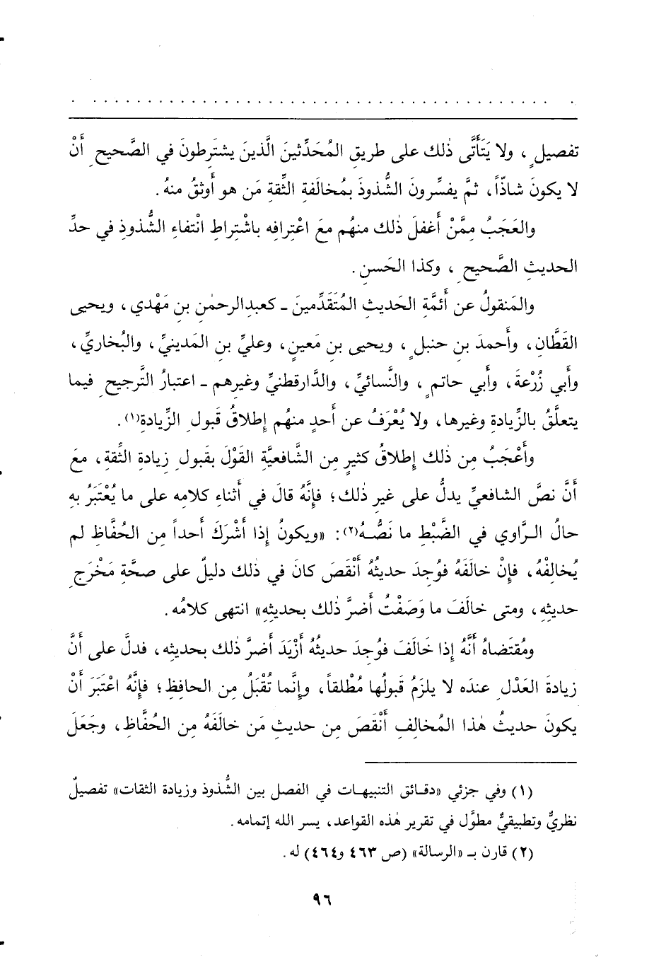 وأَعْجَبُ مِن ذلك إِطلاقُ كثيرٍ مِن الشَّافعيَّةِ القَوْلَ بقَبولِ زِيادةِ الثِّقةِ، معَ أَنَّ نصَّ الشافعيِّ يدلُّ على غيرِ ذلك؛ فإِنَّهُ قالَ في أَثناءِ كلامِه على ما يُعْتَبَرُ بهِ حالُ الرَّاوي في الضَّبْطِ ما نَصُّهُ: "ويكونُ إِذا أشْرَك أَحداً مِن الحُفَّاظِ لم يُخالِفْهُ، فإِنْ خالَفَهُ فوُجِدَ حديثُهُ أَنْقَصَ كانَ في ذلك دليلٌ على صحَّةِ مَخْرَجِ حديثِهِ، ومتى خالَفَ ما وَصَفْتُ أَضرَّ ذلك بحديثِهِ" انتهى كلامه.