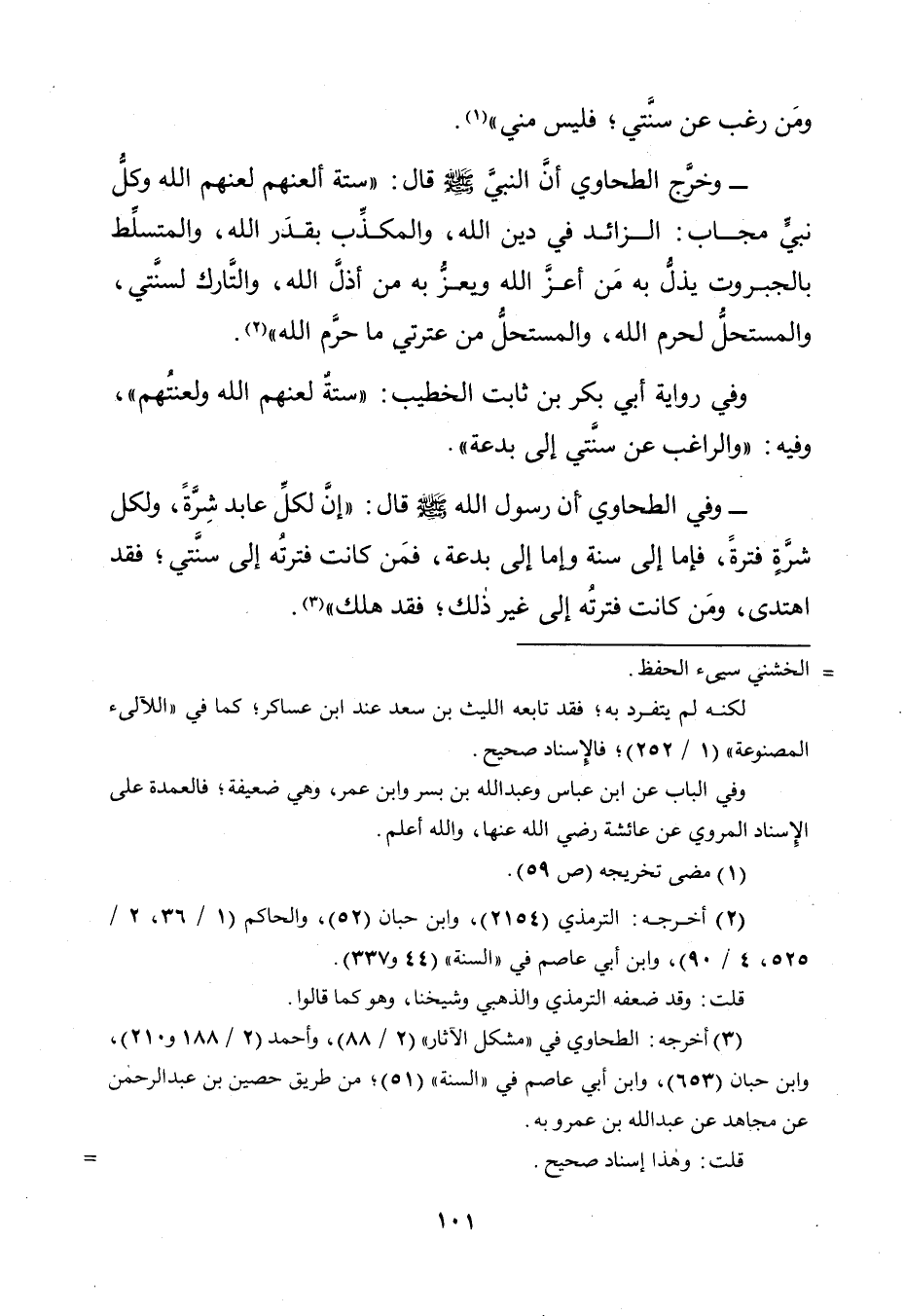 وَخَرَّجَ الطَّحَاوِيُّ أَنَّ النَّبِيَّ صَلَّى اللَّهُ عَلَيْهِ وَسَلَّمَ قَالَ: «سِتَّةٌ أَلْعَنُهُمْ لَعَنَهُمُ اللَّهُ وَكُلُّ نَبِيٍّ مُجَابٍ: الزَّائِدُ فِي دِينِ اللَّهِ، وَالْمُكَذِّبُ بِقَدَرِ اللَّهِ، وَالْمُتَسَلِّطُ بِالْجَبَرُوتِ يُذِلُّ بِهِ مَنْ أَعَزَّ اللَّهُ وَيَعِزُّ بِهِ مَنْ أَذَلَّ اللَّهُ، وَالتَّارِكُ لِسُنَّتِي، وَالْمُسْتَحِلُّ لِحَرَمِ اللَّهِ، وَالْمُسْتَحِلُّ مِنْ عِتْرَتِي مَا حَرَّمَ اللَّهُ».