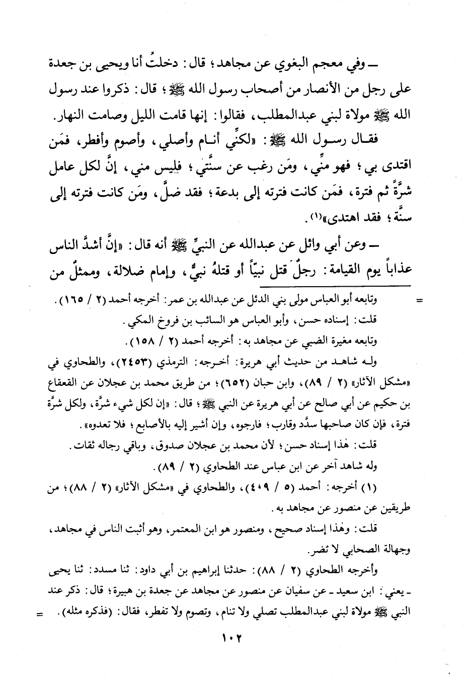 وَفِي مُعْجَمِ الْبَغَوِيِّ عَنْ مُجَاهِدٍ، قَالَ: دَخَلْتُ أَنَا وَأَبُو يَحْيَى بْنُ جَعْدَةَ عَلَى رَجُلٍ مِنَ الْأَنْصَارِ مِنْ أَصْحَابِ رَسُولِ اللَّهِ صَلَّى اللَّهُ عَلَيْهِ وَسَلَّمَ; قَالَ: «ذَكَرُوا عِنْدَ رَسُولِ اللَّهِ صَلَّى اللَّهُ عَلَيْهِ وَسَلَّمَ مَوْلَاةً لِبَنِي عَبْدِ الْمُطَّلِبِ، فَقَالُوا: إِنَّهَا قَامَتِ اللَّيْلَ وَصَامَتِ النَّهَارَ، فَقَالَ رَسُولُ اللَّهِ صَلَّى اللَّهُ عَلَيْهِ وَسَلَّمَ: لَكِنِّي أَنَامُ وَأُصَلِّي، وَأَصُومُ وَأُفْطِرُ، فَمَنِ اقْتَدَى بِي فَهُوَ مِنِّي، وَمَنْ رَغِبَ عَنْ سُنَّتِي، فَلَيْسَ مِنِّي، إِنَّ لِكُلِّ عَامِلٍ شِرَّةً ثُمَّ فَتْرَةً، فَمَنْ كَانَتْ فَتْرَتُهُ إِلَى بِدْعَةٍ، فَقَدْ ضَلَّ، وَمَنْ كَانَتْ فَتْرَتُهُ إِلَى سُّنَّةٍ فَقَدِ اهْتَدَى».