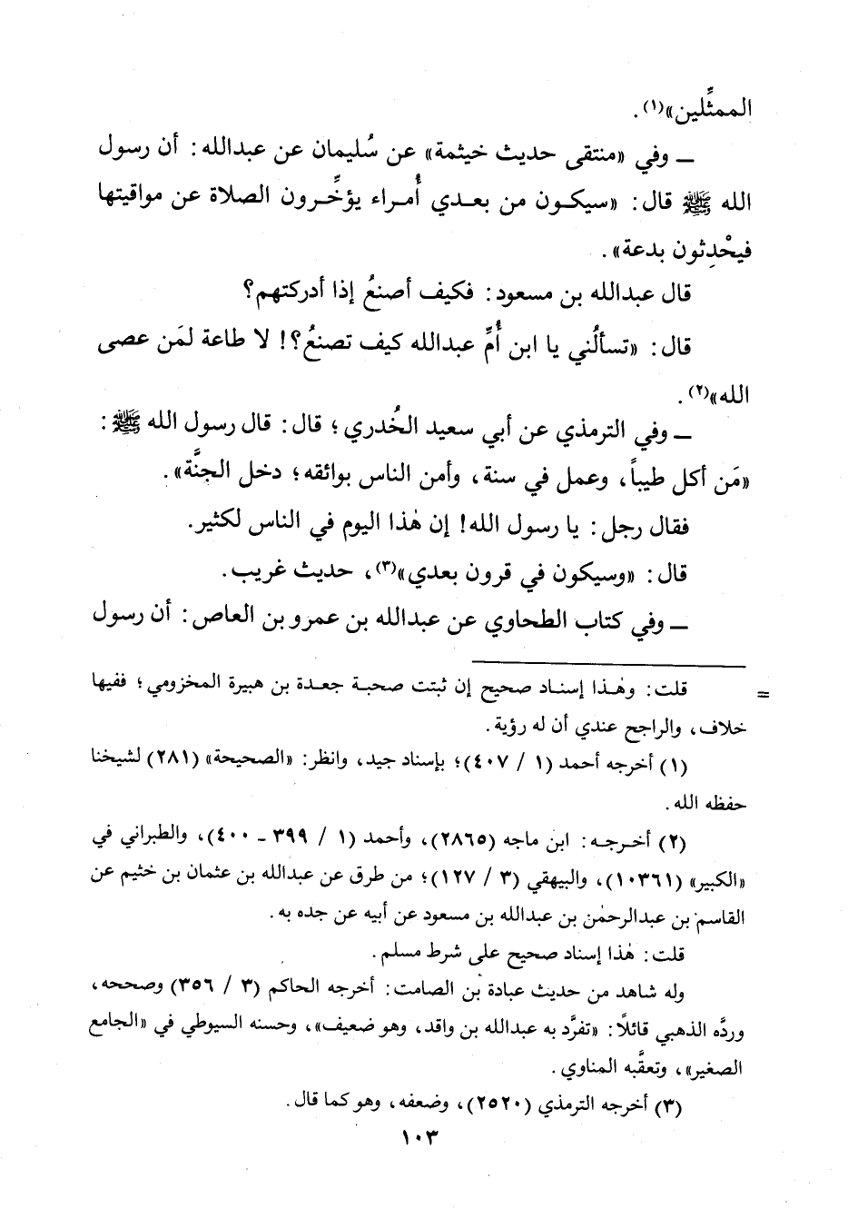 وَفِي " مُنْتَقَى حَدِيثِ خَيْثَمَةَ " عَنْ سُلَيْمَانَ، عَنْ عَبْدِ اللَّهِ: أَنَّ رَسُولَ اللَّهِ صَلَّى اللَّهُ عَلَيْهِ وَسَلَّمَ قَالَ: «سَيَكُونُ مِنْ بَعْدِي أُمَرَاءُ يُؤَخِّرُونَ الصَّلَاةَ عَنْ مَوَاقِيتِهَا، فَيُحْدِثُونَ الْبِدْعَةَ، قَالَ عَبْدُ اللَّهِ بْنُ مَسْعُودٍ: فَكَيْفَ أَصْنَعُ إِذَا أَدْرَكْتُهُمْ؟ قَالَ: تَسْأَلُنِي يَا ابْنَ أُمِّ عَبْدِ اللَّهِ كَيْفَ تَصْنَعُ؟ لَا طَاعَةَ لِمَنْ عَصَى اللَّهَ».