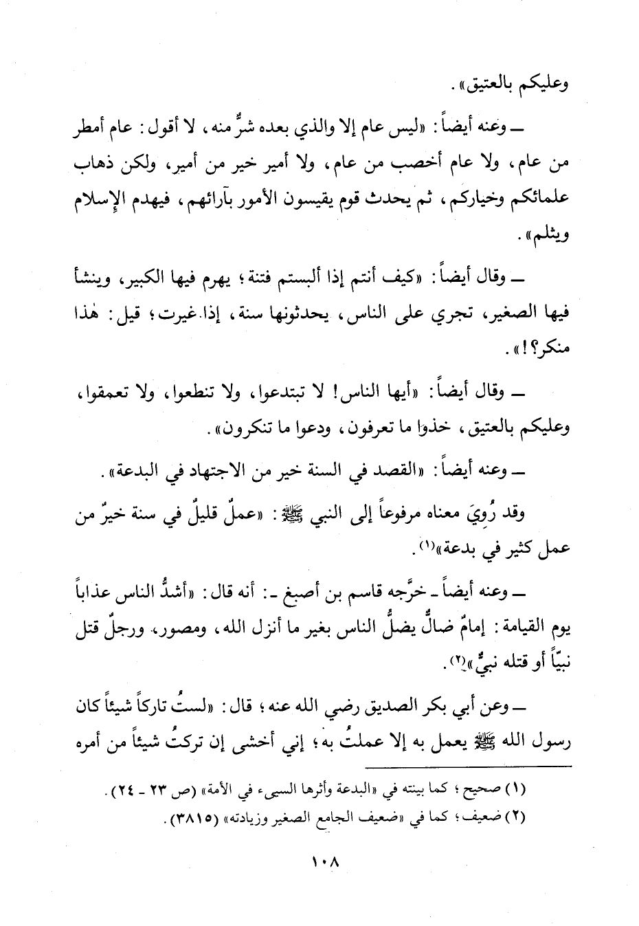 وَقَالَ أَيْضًا: " أَيُّهَا النَّاسُ! لَا تَبْتَدِعُوا، وَلَا تَنَطَّعُوا، وَلَا تَعَمَّقُوا، وَعَلَيْكُمْ بِالْعَتِيقِ، خُذُوا مَا تَعْرِفُونَ، وَدَعُوا مَا تُنْكِرُونَ ".