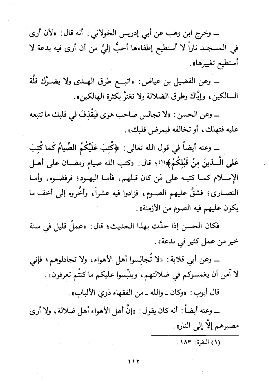 وَعَنِ الْفُضَيْلِ بْنِ عِيَاضٍ: " اتَّبِعْ طُرُقَ الْهُدَى وَلَا يَضُرُّكَ قِلَّةُ السَّالِكِينَ، وَإِيَّاكَ وَطُرُقَ الضَّلَالَةِ وَلَا تَغْتَرَّ بِكَثْرَةِ الْهَالِكِينَ ".