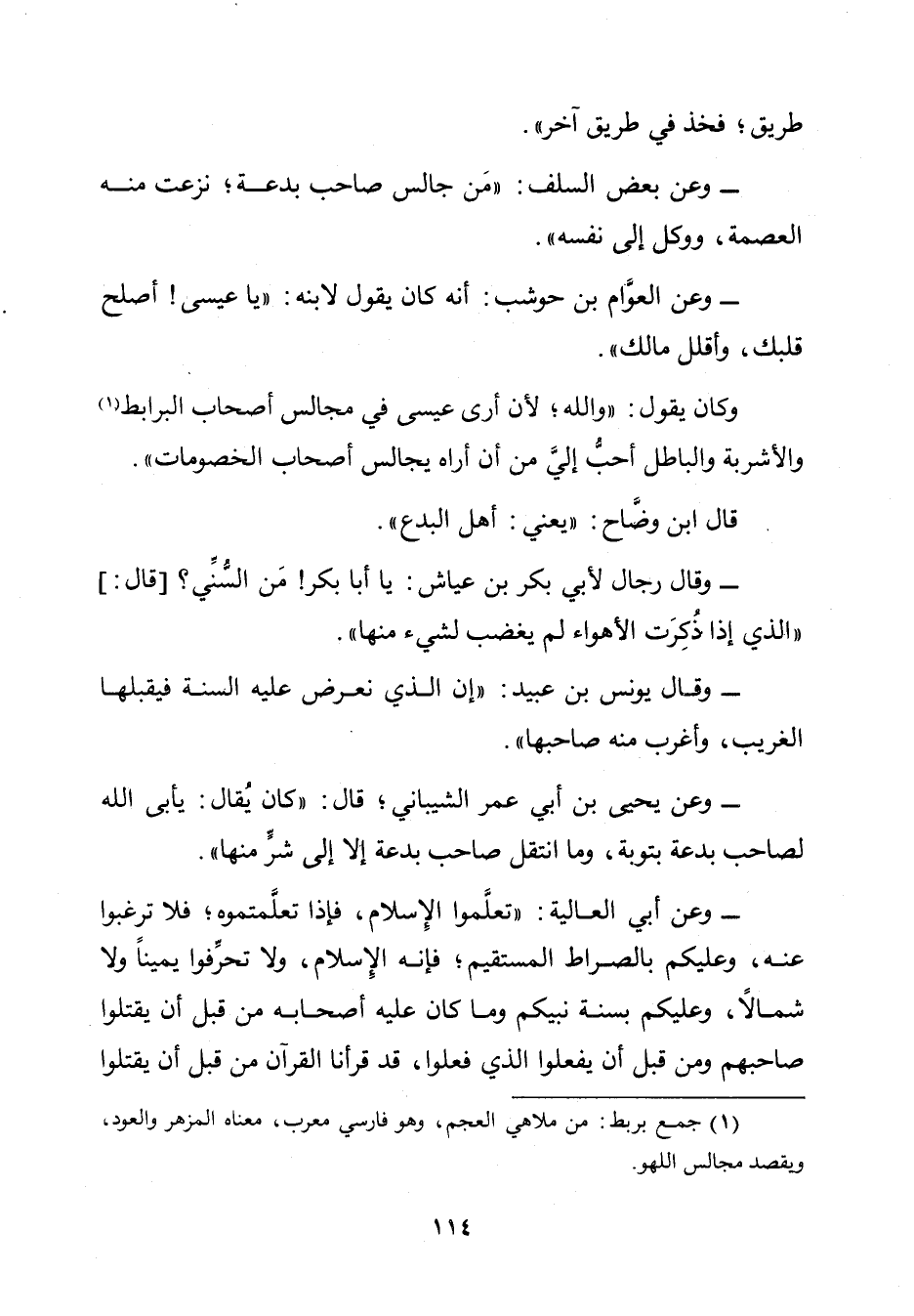 وَعَنْ بَعْضِ السَّلَفِ: " مَنْ جَالَسَ صَاحِبَ بِدْعَةٍ، نُزِعَتْ مِنْهُ الْعِصْمَةُ، وَوُكِلَ إِلَى نَفْسِهِ.