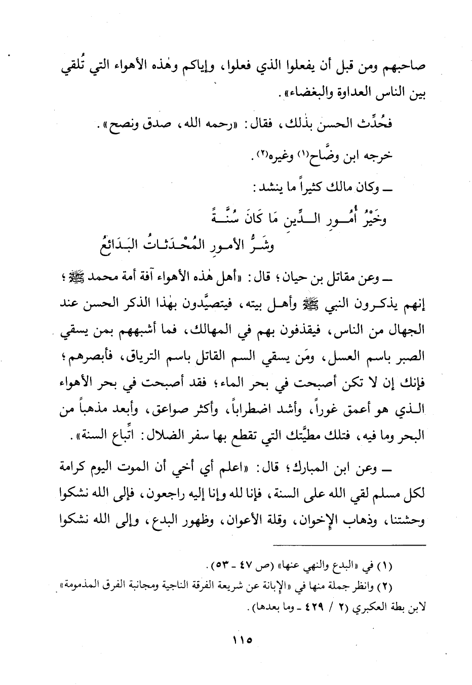 وَخَيْرُ أُمُورِ الدِّينِ مَا كَانَ سُّنَّةً ... وَشَرُّ الْأُمُورِ الْمُحْدَثَاتُ الْبَدَائِعُ
