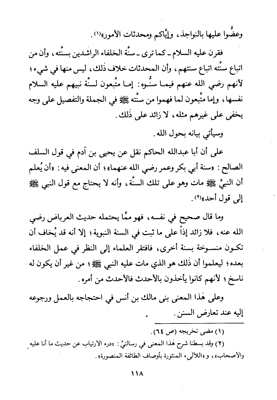 عَلَى أَنَّ أَبَا عَبْدِ اللَّهِ الْحَاكِمَ نَقَلَ عَنْ يَحْيَى بْنِ آدَمَ قَوْلَ السَّلَفِ الصَّالِحِ: " سُنَّةَ أَبِي بَكْرٍ وَعُمَرَ رَضِيَ اللَّهُ عَنْهُمَا "، أَنَّ الْمَعْنَى فِيهِ: " أَنْ يُعْلَمَ أَنَّ النَّبِيَّ صَلَّى اللَّهُ عَلَيْهِ وَسَلَّمَ مَاتَ وَهُوَ عَلَى تِلْكَ السُّنَّةِ، وَأَنَّهُ لَا يُحْتَاجُ مَعَ قَوْلِ النَّبِيِّ صَلَّى اللَّهُ عَلَيْهِ وَسَلَّمَ إِلَى قَوْلِ أَحَدٍ ".