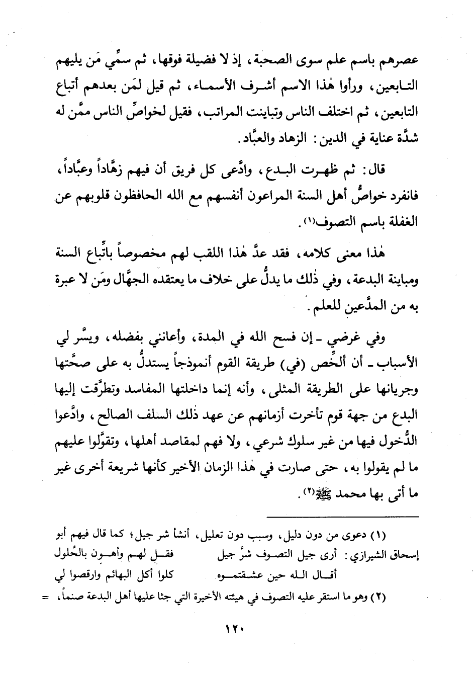 وَفِي غَرَضِي إِنْ فَسَحَ اللَّهُ فِي الْمُدَّةِ، وَأَعَانَنِي بِفَضْلِهِ، وَيَسَّرَ لِيَ الْأَسْبَابَ أَنْ أُلَخِّصَ فِي طَرِيقَةِ الْقَوْمِ أُنْمُوذَجًا يُسْتَدَلُّ بِهِ عَلَى صِحَّتِهَا وَجَرَيَانِهَا عَلَى الطَّرِيقَةِ الْمُثْلَى، وَأَنَّهُ إِنَّمَا دَاخَلَتْهَا الْمَفَاسِدُ وَتَطَرَّقَتْ إِلَيْهَا الْبِدَعُ مِنْ جِهَةِ قَوْمٍ تَأَخَّرَتْ أَزْمَانُهُمْ عَنْ عَهْدِ ذَلِكَ السَّلَفِ الصَّالِحِ، وَادَّعَوُا الدُّخُولَ فِيهَا مِنْ غَيْرِ سُلُوكٍ شَرْعِيٍّ، وَلَا فَهْمٍ لِمَقَاصِدِ أَهْلِهَا، وَتَقَوَّلُوا عَلَيْهِمْ مَا لَمْ يَقُولُوا بِهِ، حَتَّى صَارَتْ فِي هَذَا الزَّمَانِ الْأَخِيرِ كَأَنَّهَا شَرِيعَةٌ أُخْرَى غَيْرَ مَا أَتَى بِهَا مُحَمَّدٌ صَلَّى اللَّهُ عَلَيْهِ وَسَلَّمَ.