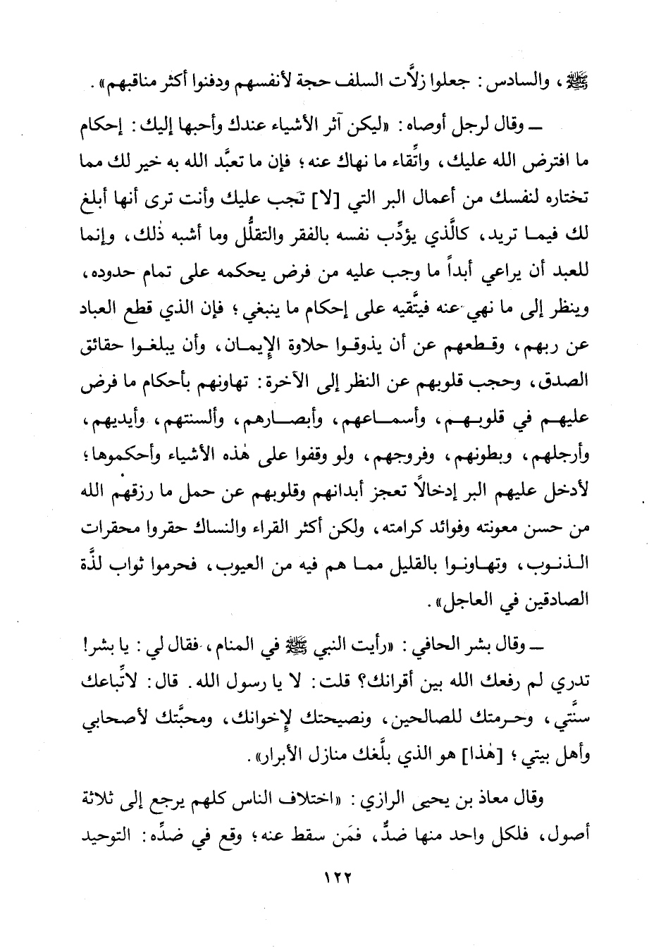 وَقَالَ بِشْرٌ الْحَافِي: " رَأَيْتُ النَّبِيَّ صَلَّى اللَّهُ عَلَيْهِ وَسَلَّمَ فِي الْمَنَامِ، فَقَالَ لِي: يَا بِشْرُ! تَدْرِي لِمَ رَفَعَكَ اللَّهُ بَيْنَ أَقْرَانِكَ؟ قُلْتُ: لَا يَا رَسُولَ اللَّهِ، قَالَ: لِاتِّبَاعِكَ سُنَّتِي، وَحُرْمَتِكَ لِلصَّالِحِينَ، وَنَصِيحَتِكَ لِإِخْوَانِكَ، وَمَحَبَّتِكَ لِأَصْحَابِي وَأَهْلِ بَيْتِي؛ هُوَ الَّذِي بَلَّغَكَ مَنَازِلَ الْأَبْرَارِ ".