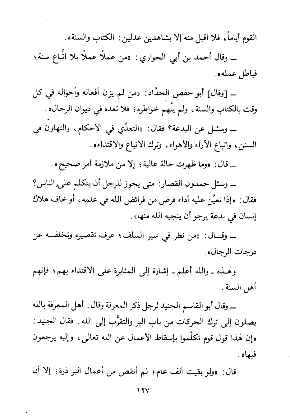 وَقَالَ أَبُو الْقَاسِمِ الْجُنَيْدِ لِرَجُلٍ ذَكَرَ الْمَعْرِفَةَ وَقَالَ: أَهْلُ الْمَعْرِفَةِ بِاللَّهِ يَصِلُونَ إِلَى تَرْكِ الْحَرَكَاتِ مِنْ بَابِ الْبِرِّ وَالتَّقَرُّبِ إِلَى اللَّهِ فَقَالَ الْجُنَيْدِ: " إِنَّ هَذَا قَوْلُ قَوْمٍ تَكَلَّمُوا بِإِسْقَاطِ الْأَعْمَالِ عَنِ اللَّهِ تَعَالَى، وَإِلَيْهِ يَرْجِعُونَ فِيهَا ".