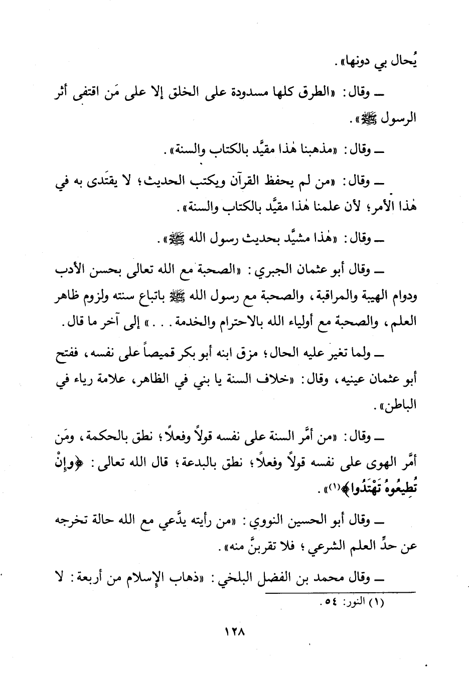 وَقَالَ: " الطُّرُقُ كُلُّهُا مَسْدُودَةٌ عَلَى الْخَلْقِ إِلَّا عَلَى مَنِ اقْتَفَى أَثَرَ الرَّسُولِ صَلَّى اللَّهُ عَلَيْهِ وَسَلَّمَ ".