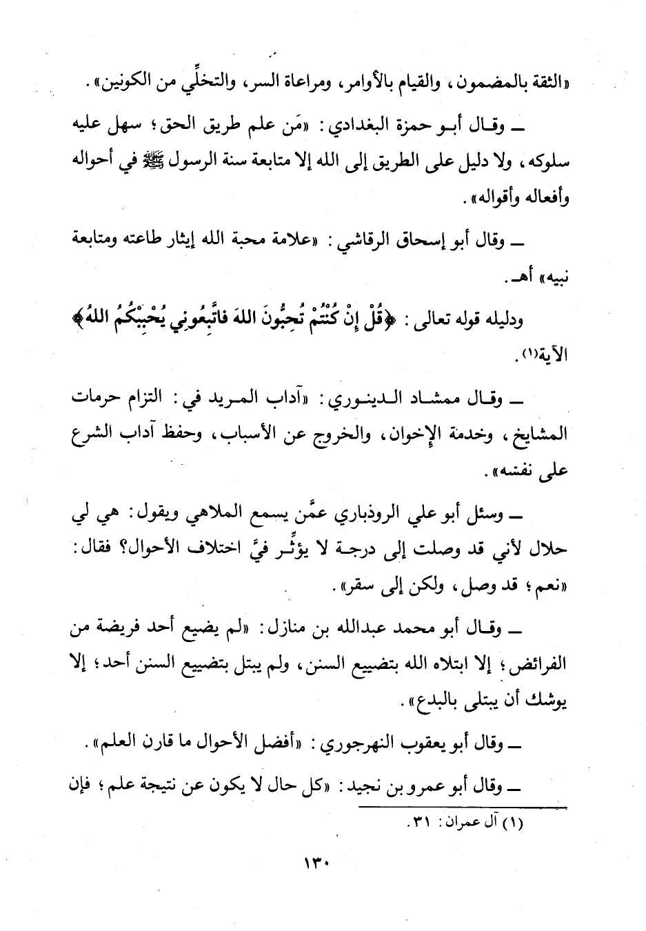 وَقَالَ أَبُو حَمْزَةَ الْبَغْدَادِيُّ: " مَنْ عَلِمَ طَرِيقَ الْحَقِّ سَهُلَ عَلَيْهِ سُلُوكُهُ، وَلَا دَلِيلَ عَلَى الطَّرِيقِ إِلَى اللَّهِ إِلَّا مُتَابَعَةُ سُنَّةِ الرَّسُولِ صَلَّى اللَّهُ عَلَيْهِ وَسَلَّمَ فِي أَحْوَالِهِ وَأَفْعَالِهِ وَأَقْوَالِهِ.