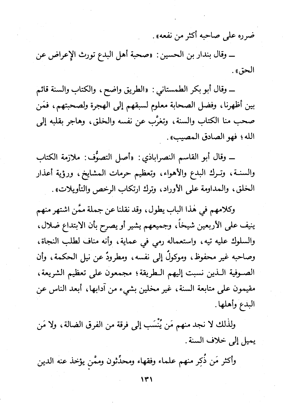 وَكَلَامُهُمْ فِي هَذَا الْبَابِ يَطُولُ، وَقَدْ نَقَلْنَا عَنْ جُمْلَةٍ مِمَّنِ اشْتُهِرَ مِنْهُمْ يَنِيفُ عَلَى الْأَرْبَعِينَ شَيْخًا، جَمِيعُهُمْ يُشِيرُ أَوْ يُصَرِّحُ بِأَنَّ الِابْتِدَاعَ ضَلَالٌ وَالسُّلُوكَ عَلَيْهِ تِيهٌ، وَاسْتِعْمَالُهُ رَمْيٌ فِي عَمَايَةٍ، وَأَنَّهُ مُنَافٍ لِطَلَبِ النَّجَاةِ، وَصَاحِبُهُ غَيْرُ مَحْفُوظٍ، وَمَوْكُولٌ إِلَى نَفْسِهِ، وَمَطْرُودٌ عَنْ نَيْلِ الْحِكْمَةِ، وَأَنَّ الصُّوفِيَّةَ الَّذِينَ نُسِبَتْ إِلَيْهِمُ الطَّرِيقَةُ; مُجْمِعُونَ عَلَى تَعْظِيمِ الشَّرِيعَةِ، مُقِيمُونَ عَلَى مُتَابَعَةِ السُّنَّةِ، غَيْرُ مُخِلِّينَ بِشَيْءٍ مِنْ آدَابِهَا، أَبْعَدُ النَّاسِ عَنِ الْبِدَعِ وَأَهْلِهَا.