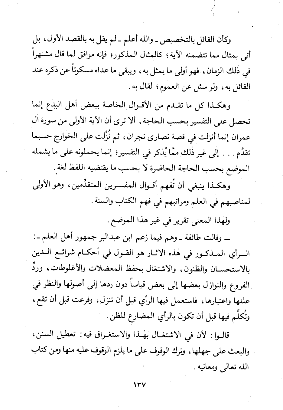 وَهَكَذَا كُلُّ مَا تَقَدَّمَ مِنَ الْأَقْوَالِ الْخَاصَّةِ بِبَعْضِ أَهْلِ الْبِدَعِ إِنَّمَا تَحْصُلُ عَلَى التَّفْسِيرِ بِحَسَبِ الْحَاجَةِ، أَلَا تَرَى أَنَّ الْآيَةَ الْأُولَى مِنْ سُورَةِ آلِ عِمْرَانَ إِنَّمَا أُنْزِلَتْ فِي قِصَّةِ نَصَارَى نَجْرَانَ، ثُمَّ نَزَلَتْ عَلَى الْخَوَارِجِ حَسْبَمَا تَقَدَّمَ إِلَى غَيْرِ ذَلِكَ مِمَّا يُذْكَرُ فِي التَّفْسِيرِ، إِنَّمَا يَحْمِلُونَهُ عَلَى مَا يَشْمَلُهُ الْمَوْضِعُ بِحَسَبِ الْحَاجَةِ الْحَاضِرَةِ لَا بِحَسَبِ مَا يَقْتَضِيهِ اللَّفْظُ لُغَةً.