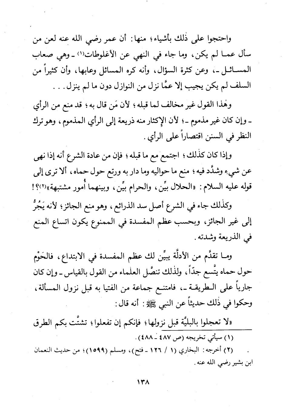 وَاحْتَجُّوا عَلَى ذَلِكَ بِأَشْيَاءَ، مِنْهَا: أَنَّ عُمَرَ رَضِيَ اللَّهُ عَنْهُ لَعَنَ مَنْ سَأَلَ عَمَّا لَمْ يَكُنْ، وَمَا جَاءَ مِنَ النَّهْيِ عَنِ الْأُغْلُوطَاتِ، وَهِيَ صِعَابُ الْمَسَائِلِ، وَعَنْ كَثْرَةِ السُّؤَالِ، وَأَنَّهُ كَرِهَ الْمَسَائِلَ وَعَابَهَا، وَإِنَّ كَثِيرًا مِنَ السَّلَفِ لَمْ يَكُنْ يُجِيبُ إِلَّا عَمَّا نَزَلَ مِنَ النَّوَازِلِ دُونَ مَا لَمْ يَنْزِلْ.