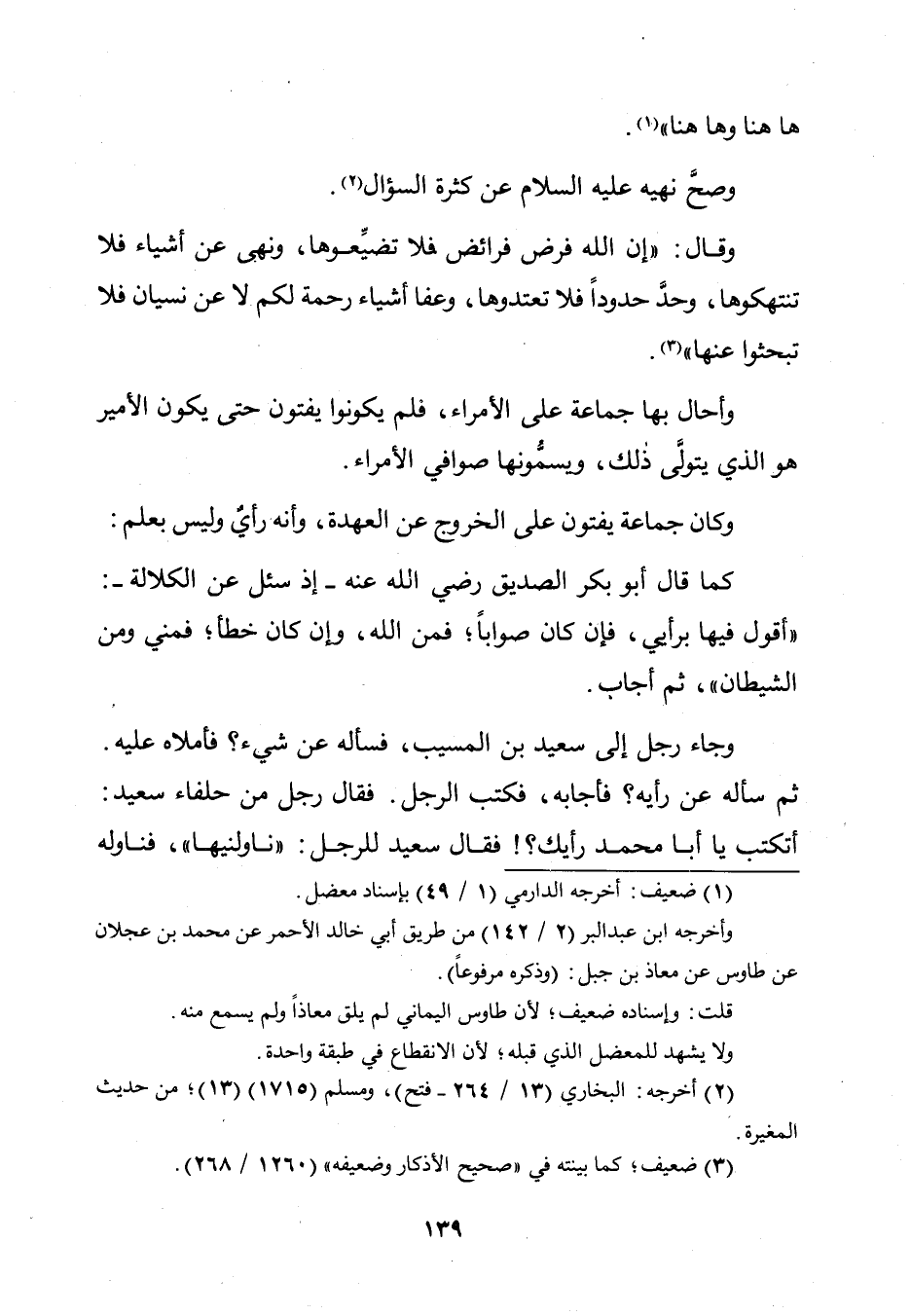 وَقَالَ: «إِنَّ اللَّهَ فَرَضَ فَرَائِضَ فَلَا تُضَيِّعُوهَا، وَنَهَى عَنْ أَشْيَاءَ فَلَا تَنْتَهِكُوهَا، وَحَدَّ حُدُودًا فَلَا تَعْتَدُوهَا، وَعَفَا عَنْ أَشْيَاءَ رَحْمَةً لَكُمْ لَا عَنْ نِسْيَانٍ فَلَا تَبْحَثُوا عَنْهَا».