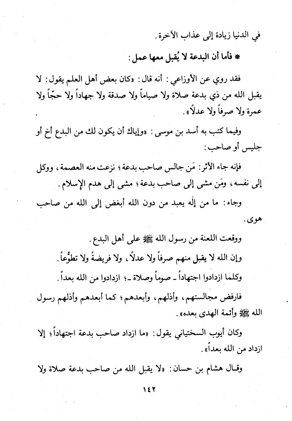 وَكَانَ أَيُّوبُ السَّخْتِيَانِيُّ يَقُولُ: " مَا ازْدَادَ صَاحِبُ بِدْعَةٍ اجْتِهَادًا إِلَّا ازْدَادَ مِنَ اللَّهِ بُعْدًا ". وَقَالَ هِشَامُ بْنُ حَسَّانَ: " لَا يَقْبَلُ اللَّهُ مِنْ صَاحِبِ بِدْعَةٍ صَلَاةً وَلَا