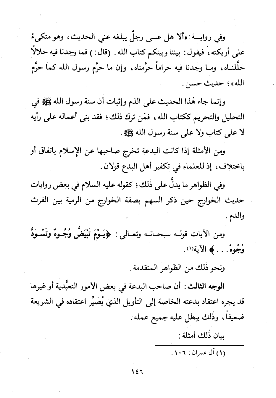 الْوَجْهُ الثَّالِثُ: أَنَّ صَاحِبَ الْبِدْعَةِ فِي بَعْضِ الْأُمُورِ التَّعَبُّدِيَّةِ أَوْ غَيْرِهَا قَدْ يَجُرُّهُ اعْتِقَادُ بِدْعَتِهِ الْخَاصَّةِ إِلَى التَّأْوِيلِ الَّذِي يُصَيِّرُ اعْتِقَادَهُ فِي الشَّرِيعَةِ ضَعِيفًا، وَذَلِكَ يُبْطِلُ عَلَيْهِ جَمِيعَ عَمَلِهِ.