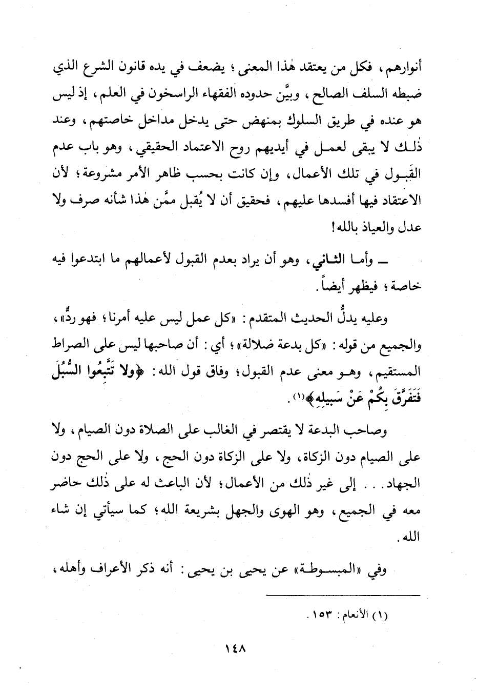 وَعَلَيْهِ يَدُلُّ الْحَدِيثُ الْمُتَقَدِّمُ: «كُلُّ عَمَلٍ لَيْسَ عَلَيْهِ أَمْرُنَا فَهُوَ رَدٌّ» وَالْجَمِيعُ مِنْ قَوْلِهِ: «كُلُّ بِدْعَةٍ ضَلَالَةٌ»، أَيْ: إِنَّ صَاحِبَهَا لَيْسَ عَلَى الصِّرَاطِ الْمُسْتَقِيمِ، وَهُوَ مَعْنَى عَدَمِ الْقَبُولِ، وِفَاقَ قَوْلِ اللَّهِ: {وَلَا تَتَّبِعُوا السُّبُلَ فَتَفَرَّقَ بِكُمْ عَنْ سَبِيلِهِ} [الأنعام: 153].