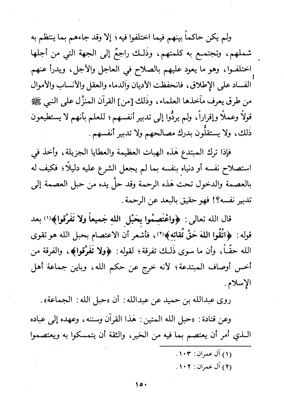 فَإِذَا تَرَكَ الْمُبْتَدِعُ هَذِهِ الْهِبَاتِ الْعَظِيمَةَ وَالْعَطَايَا الْجَزِيلَةَ، وَأَخَذَ فِي اسْتِصْلَاحِ نَفْسِهِ أَوْ دُنْيَاهُ بِنَفْسِهِ بِمَا لَمْ يَجْعَلِ الشَّرْعُ عَلَيْهِ دَلِيلًا، فَكَيْفَ لَهُ بِالْعِصْمَةِ وَالدُّخُولِ تَحْتَ هَذِهِ الرَّحْمَةِ؟ وَقَدْ حَلَّ يَدَهُ مِنْ حَبْلِ الْعِصْمَةِ إِلَى تَدْبِيرِ نَفْسِهِ، فَهُوَ حَقِيقٌ بِالْبُعْدِ عَنِ الرَّحْمَةِ. قَالَ اللَّهُ تَعَالَى: {وَاعْتَصِمُوا بِحَبْلِ اللَّهِ جَمِيعًا وَلَا تَفَرَّقُوا} [آل عمران: 103] بَعْدَ قَوْلِهِ: {اتَّقُوا اللَّهَ حَقَّ تُقَاتِهِ} [آل عمران: 102]، فَأَشْعُرُ أَنَّ الِاعْتِصَامَ بِحَبْلِ اللَّهِ هُوَ تَقْوَى اللَّهِ حَقًّا، وَأَنَّ مَا سِوَى ذَلِكَ تَفْرِقَةٌ، لِقَوْلِهِ: {وَلَا تَفَرَّقُوا} [آل عمران: 103]، وَالْفُرْقَةُ مِنْ أَخَسِّ أَوْصَافِ الْمُبْتَدِعَةِ، لِأَنَّهُ خَرَجَ عَنْ حُكْمِ اللَّهِ وَبَايَنَ جَمَاعَةَ أَهْلِ الْإِسْلَامِ.