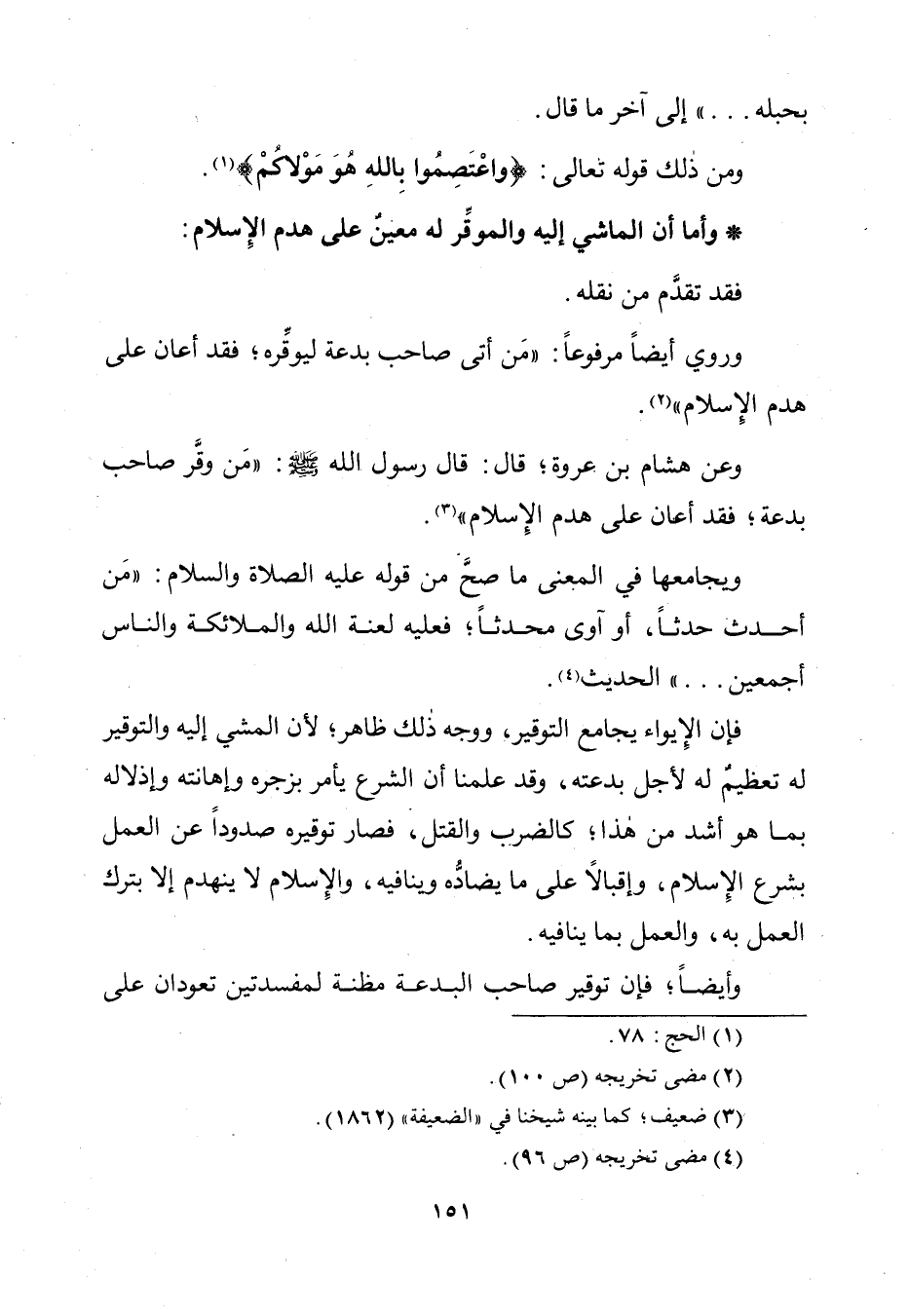 [الْمَاشِي إِلَى الْمُبْتَدِعِ وَالْمُوَقِّرِ لَهُ مُعِينٌ عَلَى هَدْمِ الْإِسْلَامِ]