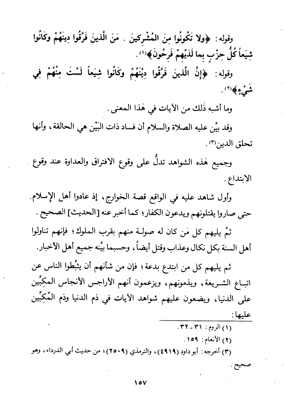 وَقَوْلِهِ: {وَلَا تَكُونُوا مِنَ الْمُشْرِكِينَ - مِنَ الَّذِينَ فَرَّقُوا دِينَهُمْ وَكَانُوا شِيَعًا كُلُّ حِزْبٍ بِمَا لَدَيْهِمْ فَرِحُونَ} [الروم: 31 - 32].