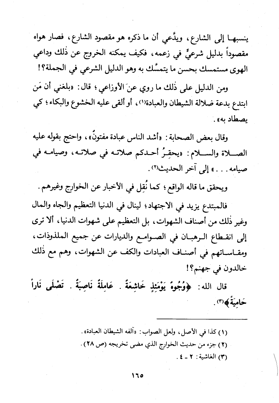 وَمِنَ الدَّلِيلِ عَلَى ذَلِكَ مَا رُوِيَ عَنِ الْأَوْزَاعِيِّ; قَالَ: " بَلَغَنِي أَنَّ مَنِ ابْتَدَعَ بِدْعَةَ ضَلَالَةٍ آلَفَهُ الشَّيْطَانُ الْعِبَادَةَ، أَوْ أَلْقَى عَلَيْهِ الْخُشُوعَ وَالْبُكَاءَ; كَيْ يَصْطَادَ بِهِ ".