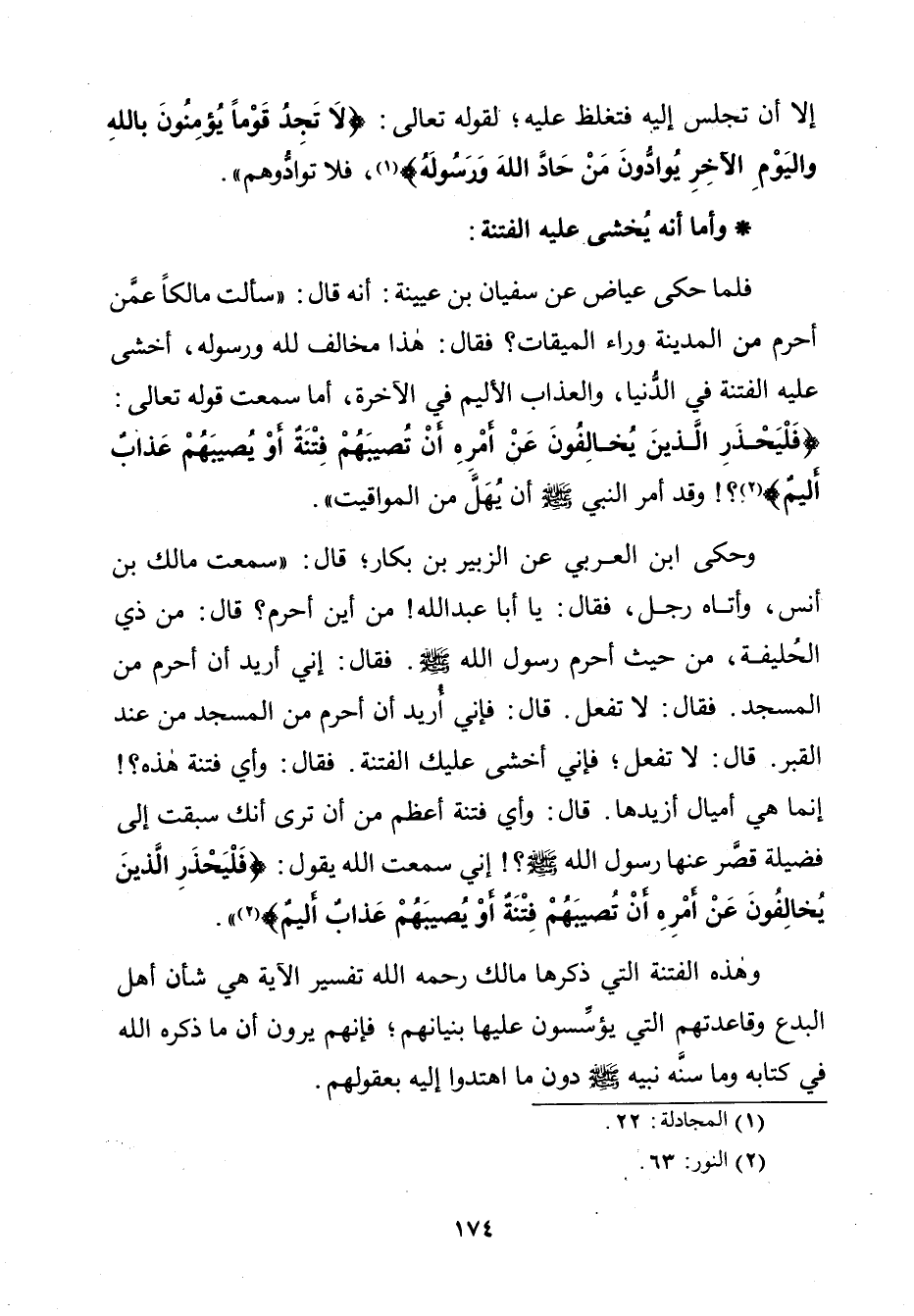 وَهَذِهِ الْفِتْنَةُ الَّتِي ذَكَرَهَا مَالِكٌ رَحِمَهُ اللَّهُ تَفْسِيرُ الْآيَةِ هِيَ شَأْنُ أَهْلِ الْبِدَعِ وَقَاعِدَتُهُمُ الَّتِي يُؤَسِّسُونَ عَلَيْهَا بُنْيَانَهُمْ، فَإِنَّهُمْ يَرَوْنَ أَنَّ مَا ذَكَرَهُ اللَّهُ فِي كِتَابِهِ وَمَا سَنَّهُ نَبِيُّهُ صَلَّى اللَّهُ عَلَيْهِ وَسَلَّمَ دُونَ مَا اهْتَدَوْا إِلَيْهِ بِعُقُولِهِمْ.