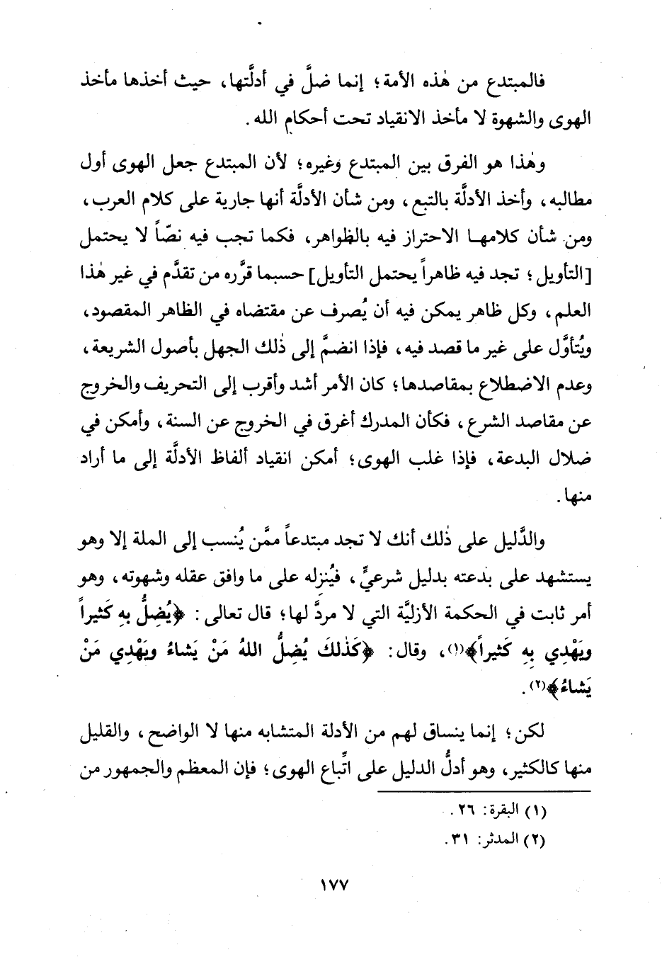 وَالدَّلِيلُ عَلَى ذَلِكَ أَنَّكَ لَا تَجِدُ مُبْتَدِعًا مِمَّنْ يُنْسَبُ إِلَى الْمِلَّةِ إِلَّا وَهُوَ يَسْتَشْهِدُ عَلَى بِدْعَتِهِ بِدَلِيلٍ شَرْعِيٍّ، فَيُنْزِلُهُ عَلَى مَا وَافَقَ عَقْلَهُ وَشَهْوَتَهُ، وَهُوَ أَمْرٌ ثَابِتٌ فِي الْحِكْمَةِ الْأَزَلِيَّةِ الَّتِي لَا مَرَدَّ لَهَا، قَالَ تَعَالَى: {يُضِلُّ بِهِ كَثِيرًا وَيَهْدِي بِهِ كَثِيرًا} [البقرة: 26]، وَقَالَ: {كَذَلِكَ يُضِلُّ اللَّهُ مَنْ يَشَاءُ وَيَهْدِي مَنْ يَشَاءُ} [المدثر: 31].