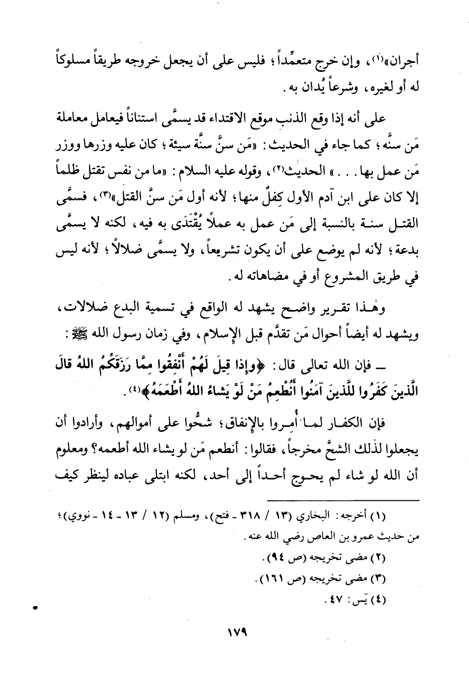 عَلَى أَنَّهُ إِذَا وَقَعَ الذَّنْبُ مَوْقِعَ الِاقْتِدَاءِ قَدْ يُسَمَّى اسْتِنَانًا فَيُعَامَلُ مُعَامَلَةُ مَنْ سَنَّهُ كَمَا جَاءَ فِي الْحَدِيثِ: «مَنْ سَنَّ سُنَّةً سَيِّئَةً، كَانَ عَلَيْهِ وِزْرُهَا وَوِزْرُ مَنْ عَمِلَ بِهَا». . . . الْحَدِيثَ، وَقَوْلُهُ عَلَيْهِ السَّلَامُ: «مَا مِنْ نَفْسٍ تُقْتَلُ ظُلْمًا إِلَّا كَانَ عَلَى ابْنِ آدَمَ الْأَوَّلِ كِفْلٌ مِنْهَا، لِأَنَّهُ أَوَّلُ مَنْ سَنَّ الْقَتْلَ»، فَسُمِّيَ الْقَتْلُ سُنَّةً بِالنِّسْبَةِ إِلَى مَنْ عَمِلَ بِهِ عَمَلًا يُقْتَدَى بِهِ فِيهِ، لَكِنَّهُ لَا يُسَمَّى بِدْعَةً; لِأَنَّهُ لَمْ يُوضَعْ عَلَى أَنْ يَكُونَ تَشْرِيعًا، وَلَا يُسَمَّى ضَلَالًا; لِأَنَّهُ لَيْسَ فِي طَرِيقِ الْمَشْرُوعِ أَوْ فِي مُضَاهَاتِهِ لَهُ.